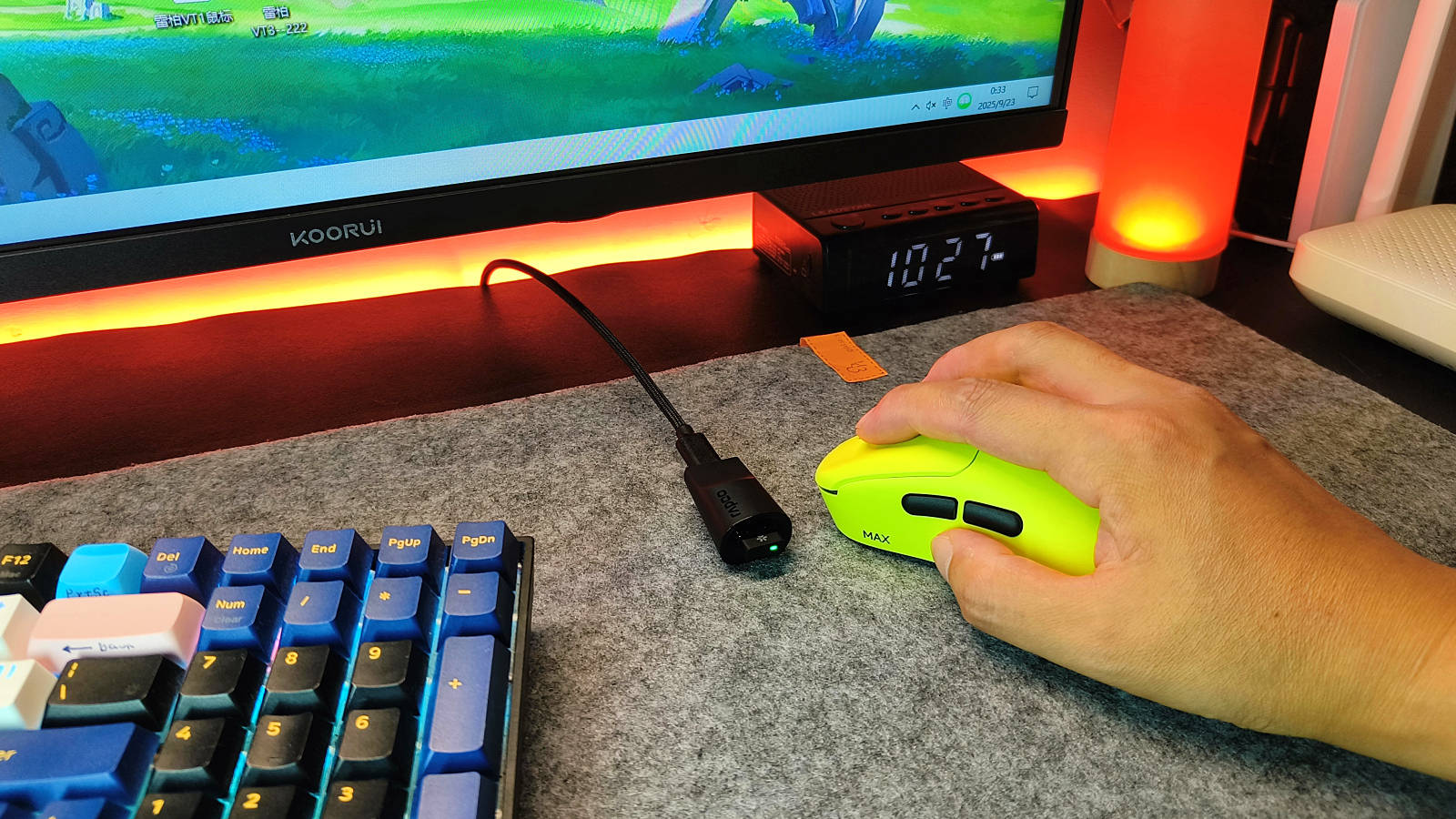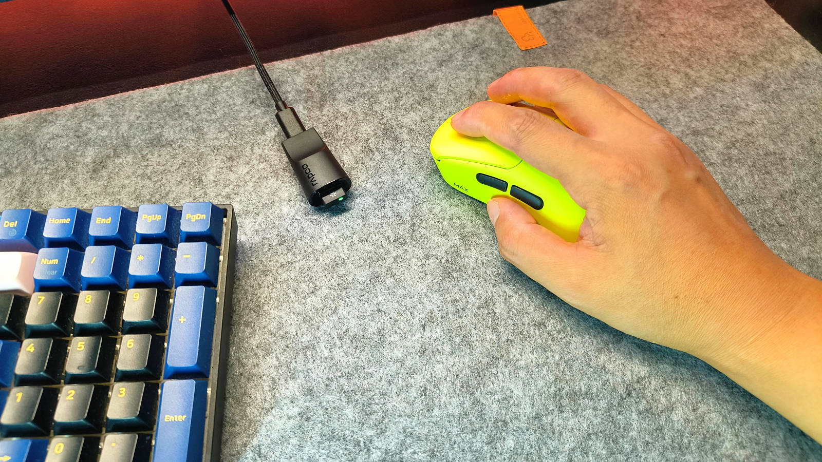 雷柏VT3s系列配备nano微型8K接收器,支持原生有线/无线双8K回报率,回报率可根据需求在8000Hz至125Hz间调节。接收器内置RGB电量指示灯,用户可根据灯光颜色来掌握鼠标状态以及电量情况,此外,在电脑开启驱动软件后可在显示器,右下角直接查看电量。