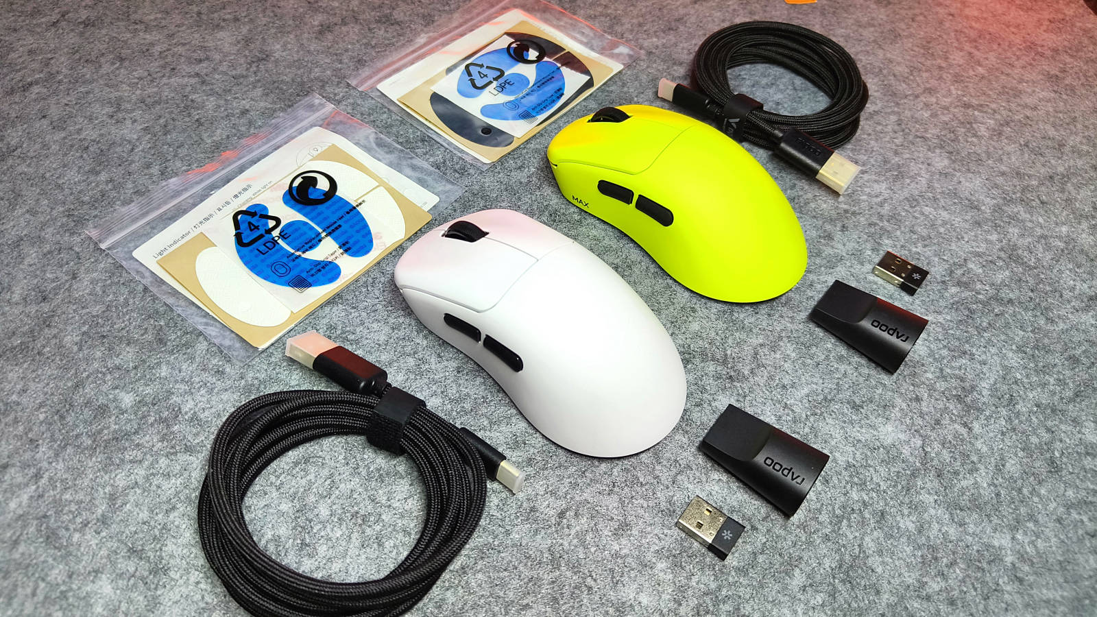 雷柏VT3s系列鼠标包装内容丰富,除鼠标本体外、高速带屏蔽数据线、支持高回报率的nano 8K无线接收器,USB转换器,备用特氟龙脚垫及专用鼠标防滑贴,齐全的配件为鼠标的长久使用提供了保障。