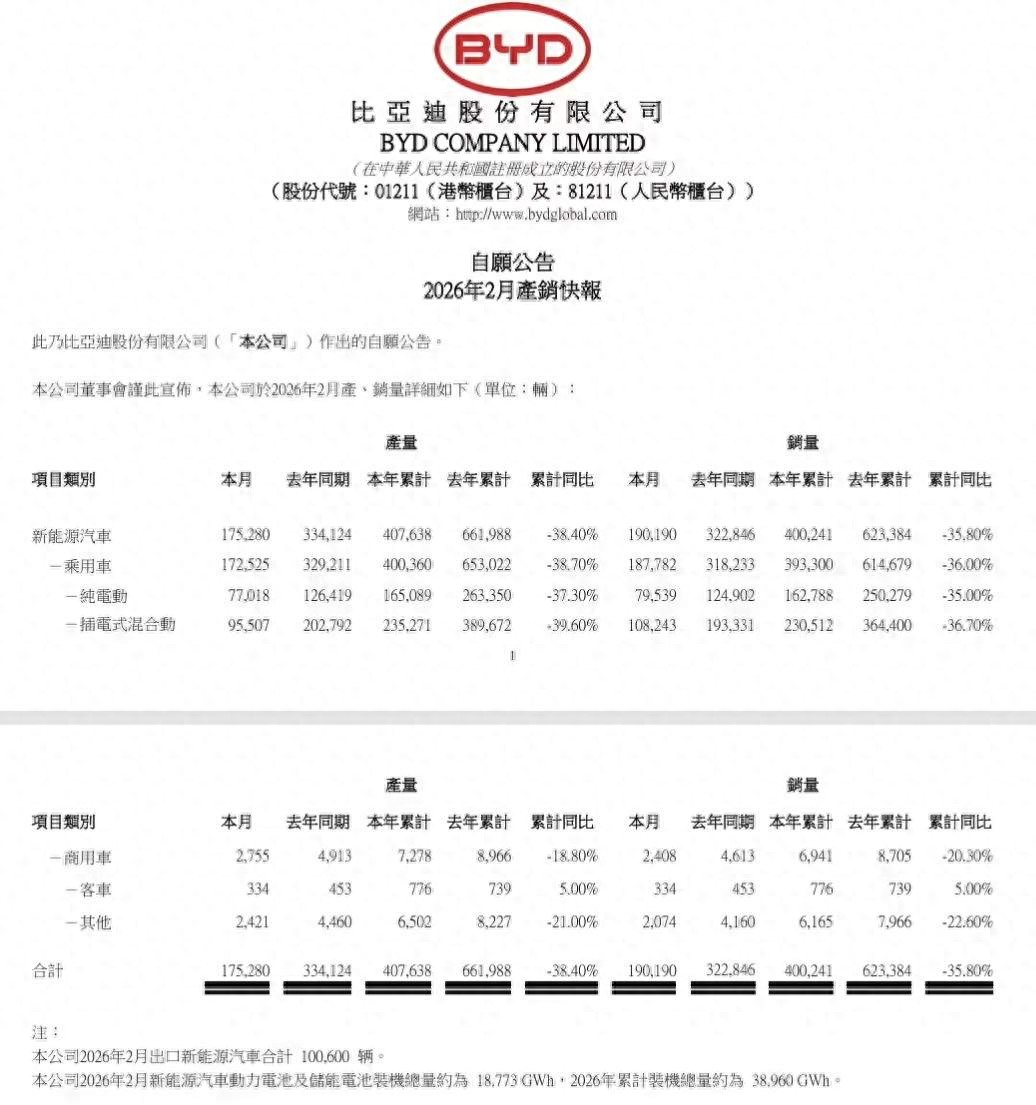 其中乘用车销量为187782辆,较去年同期的318233辆,比亚迪乘用车2月销量出现不小幅度的下跌!