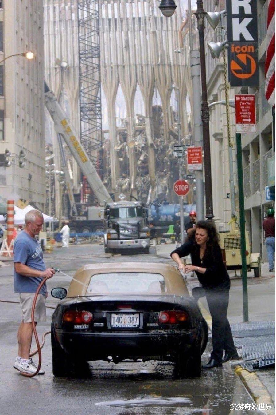 话说回来,无论发生什么,对于普通人而言,生活还得继续,倒塌的世贸大楼不远处,正在清洗车子的普通民众…