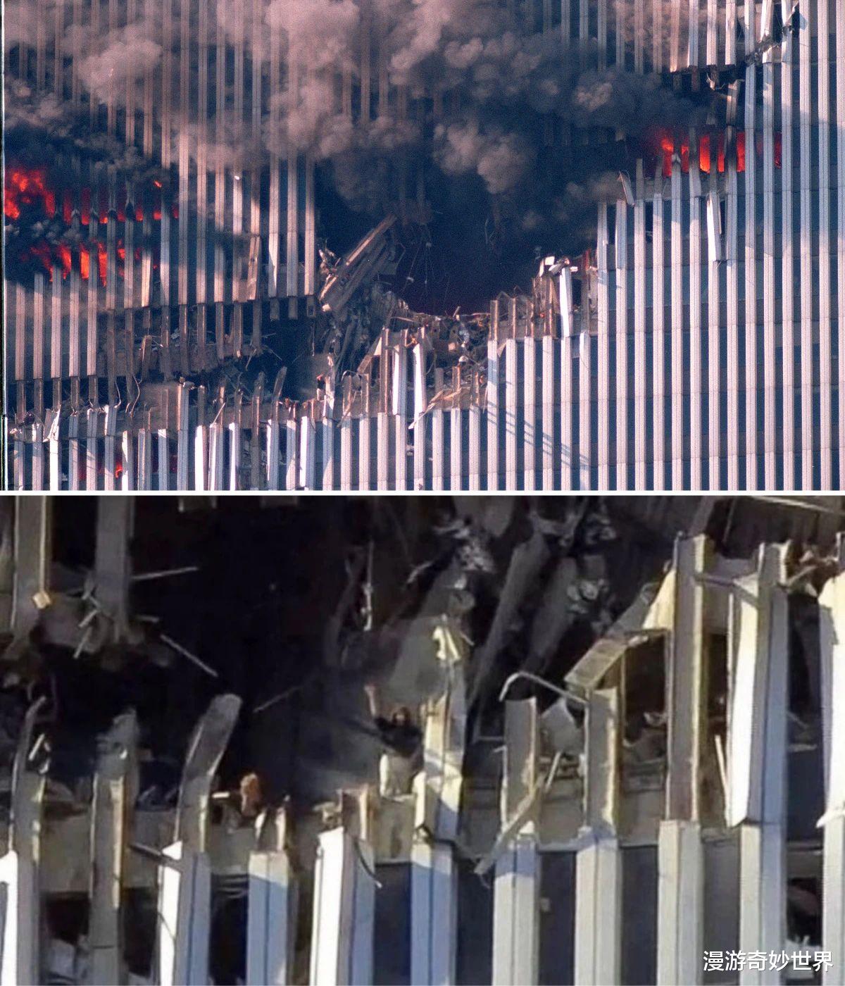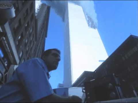 由于北塔先被撞,当时很多人都在用摄像机对着双子塔,所以大约有40多人记录下了南塔被撞的恐怖瞬间…