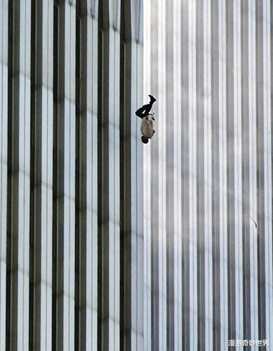 一名男子从世贸中心北塔92层坠落,自由落体时间都持续了接近10秒…因为大厦内部大火肆虐,大概100-200人因为忍不住烟雾,被迫选择了跳楼…