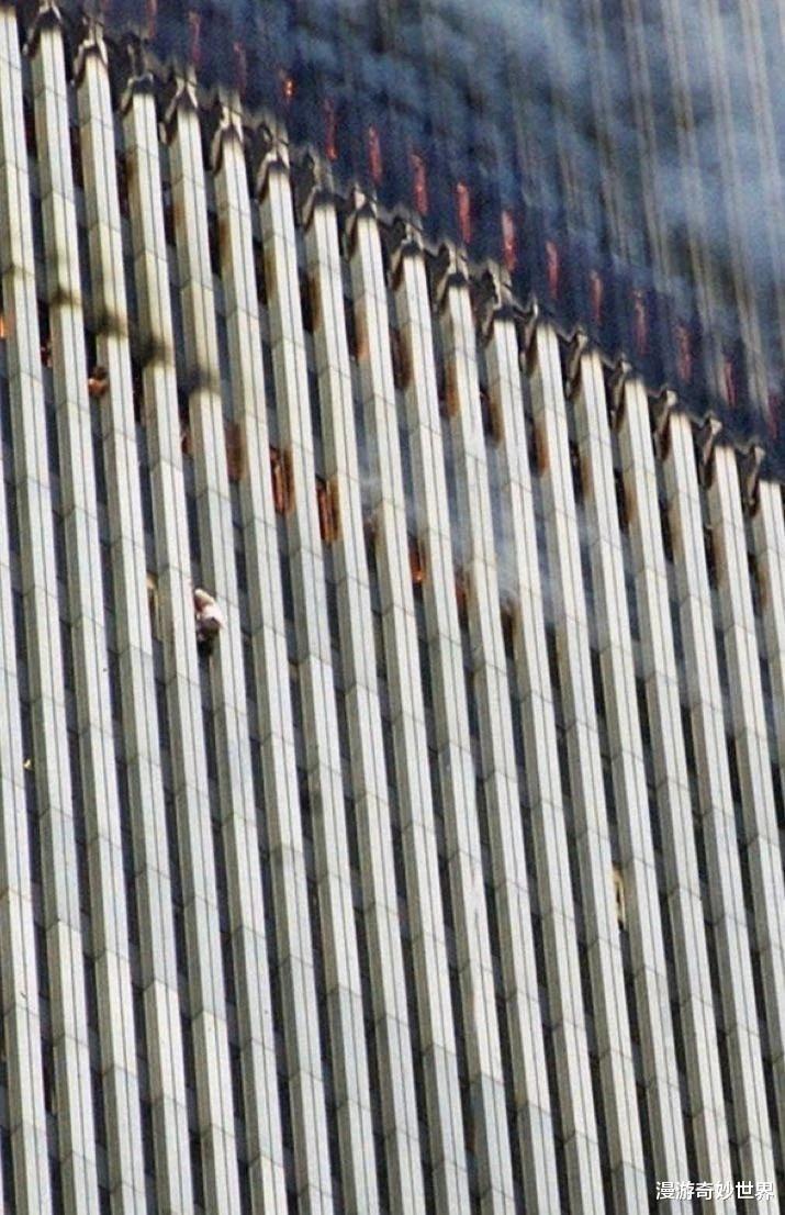 照片中北塔中的这个人,因为大火逼近,为了逃生,从94层爬到了85层,但最终因南塔倒塌而引发的震动掉了下去…没有人知道他的名字…