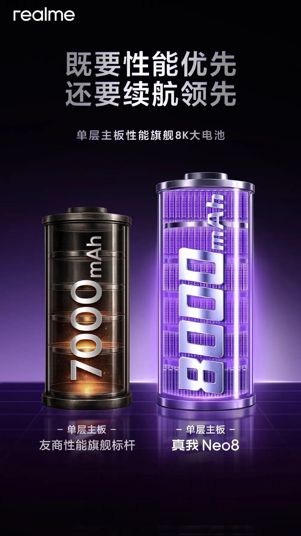 真我Neo8 搭载8000mAh大电池,抖音1.5小时、B站2小时、在线聊天2小时、游戏开黑2小时,还剩51%。五年长寿健康耐用,全场景旁路充电。