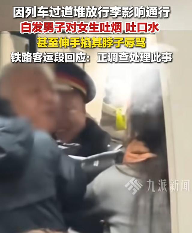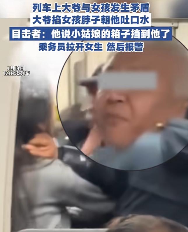乘警发现情况后马上过来阻拦,老人却更加嚣张,张开嘴巴就冲女孩的脸上吐口水,被分开后女孩连说了好几句恶心,没想到老人竟指着鼻子对女孩喊道:你再说一句试试,随后便是一句脏话。