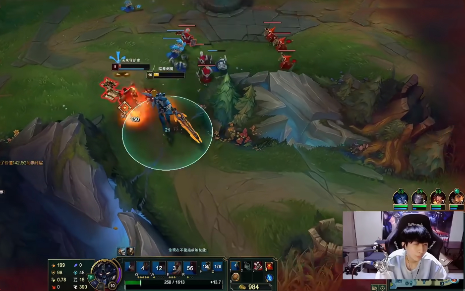 原本还没把对面的杰斯当回事的小超梦,也是在这波Gank结束之后,重新打起了精神,在5级时借助着队友凯隐的帮助,成功击杀了杰斯!获得了这次关键击杀的小超梦,到达六级之后,就再也没有给对手任何机会,当着对面打野赵信的面,开大招单杀了杰斯,打跑了赵信,直接变身为“剑魔人间体”。