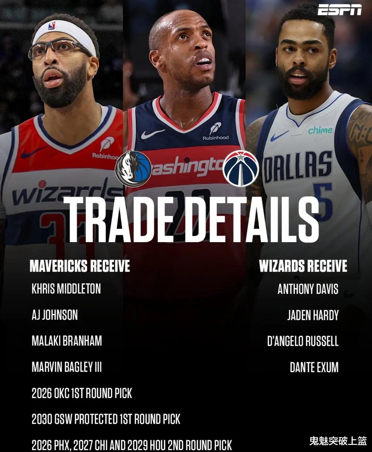 双方达成的具体交易为:独行侠送出安东尼戴维斯+杰登哈迪+德安吉洛拉塞尔+丹特埃克萨姆,从奇才换回克里斯米德尔顿+AJ约翰逊+马拉凯布兰纳姆+马文巴格利+2026年首轮签(来自雷霆)+2030年受保护首轮签(来自勇士)+2026年次轮签(来自太阳)+2027年(来自公牛)+2029年次轮签(来自火箭)。