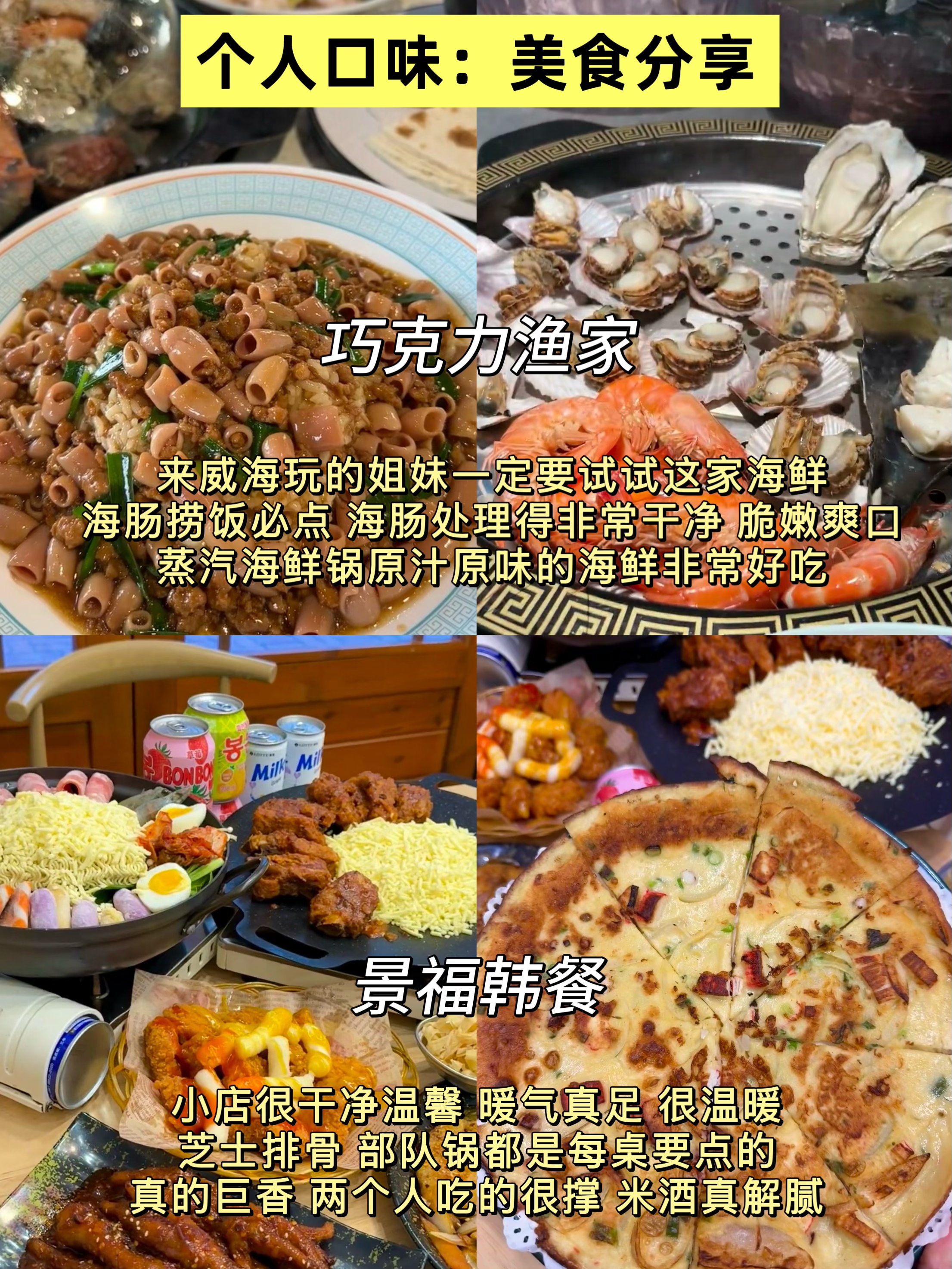 ✔️吃的方便威海的韩餐和海鲜是比较出名的;韩餐(景福韩餐、庆州韩食)海鲜(巧克力渔家)都不错👌