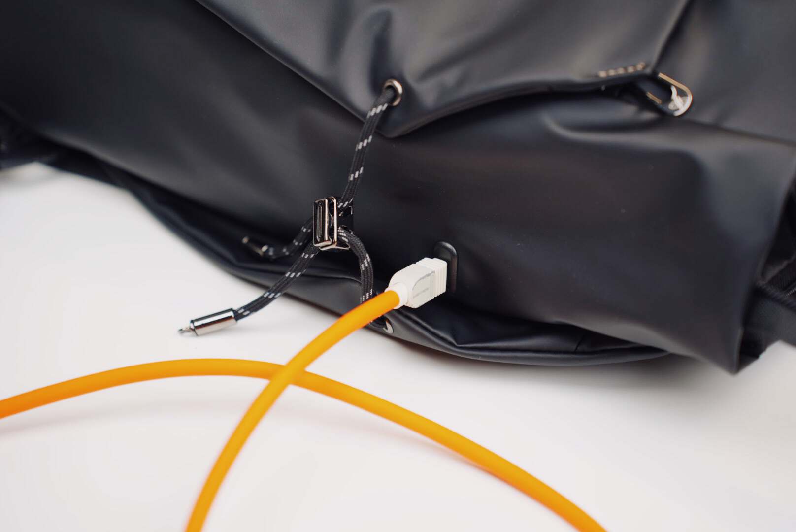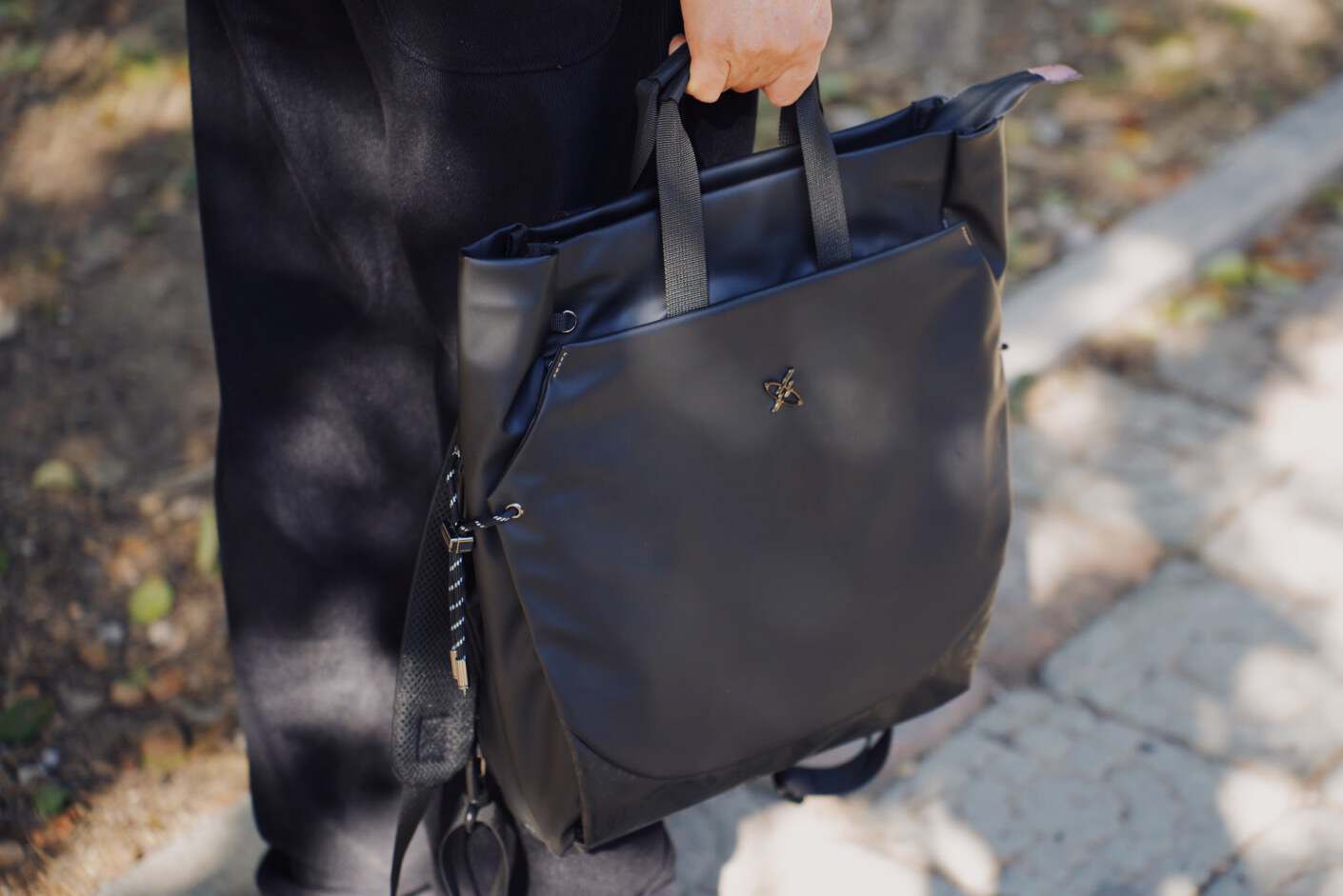 侧面还有一个贴心的设计:自带100瓦闪充接口。不知道你是否遇到过需要从包里拉出一条线的尴尬充电情形,而光影行星设置的充电口能够非常优雅的直接插在包上,不再会担心线不够长等窘境。还有一点小细节,这个包有双重背法,隐藏式的背带设计可以。非常自在的切换,你可以手拎也可以双肩,完完全全能够满足不同场景的需求