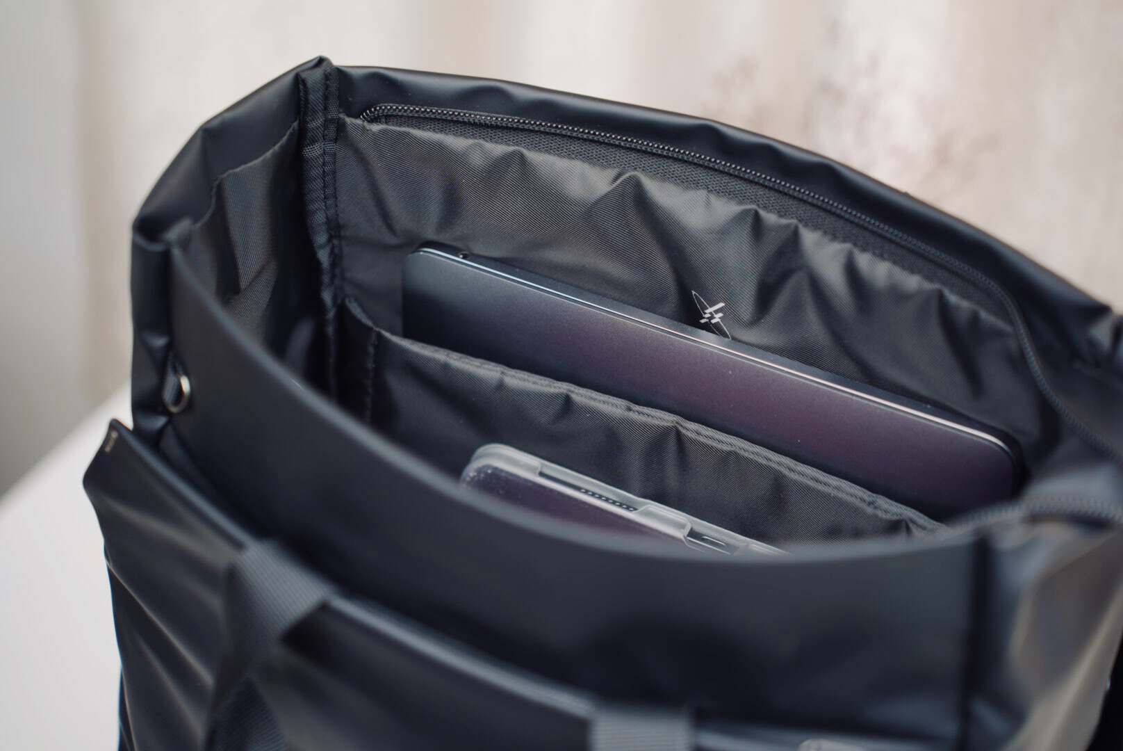 当然最打动我的其实还是这个包的收纳空间,整体体积虽然看起来很轻巧但是收纳却是实打实的。前幅有拉链快取仓,顾名思义快取便是可以放一些比较轻巧的东西:耳机、钥匙、交通卡,收纳空间绰绰有余。包的内部有半开放收纳隔层,简单来说不仅可以做到物品有序的规整,又可以做到干湿分离功能。隔层的另一边可以收纳电脑!
