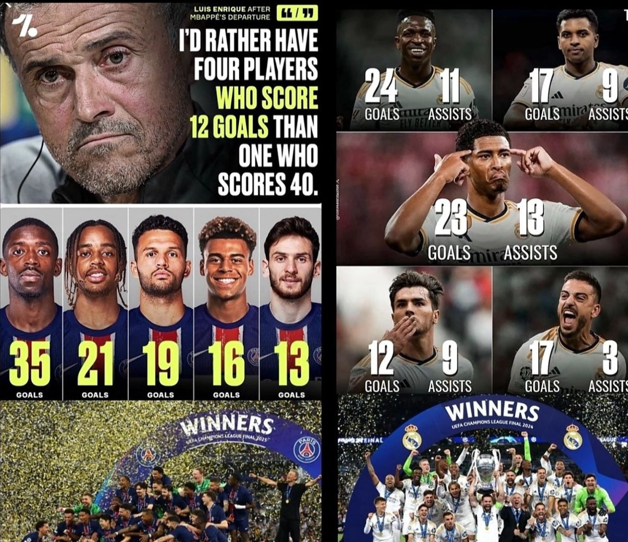 而整体化的运转,其实也还可以参照的是巴黎夺冠之前的一个赛季的皇马在23/24赛季的夺冠--那一年的皇马,在安切洛蒂的执教下其实也体现的是这种团队至上的理念--维尼修斯,贝林厄姆、罗德里戈、迪亚斯以及何塞卢等5人进球数达到了至少12粒。也正是因为总有人挺身而出,所以那一年的皇马才能淘汰拜仁并最终完成夺冠。