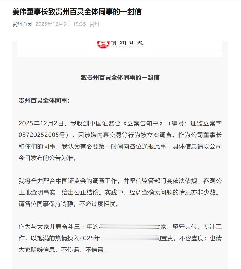 3日晚间,针对被立案调查一事,姜伟通过“贵州百灵”微信公众号发全员信。姜伟在信中称,2025年12月2日,其收到中国证监会《立案告知书》,因涉嫌内幕交易等行为被立案调查,“我将全力配合中国证监会的调查工作,并坚信监管部门会依法依规、客观公正地查明事实,给出公正结论。实践中,经调查确无问题的情况亦非少数。请各位同事保持冷静,不必过度担忧,恳请员工坚守岗位、专注工作。”