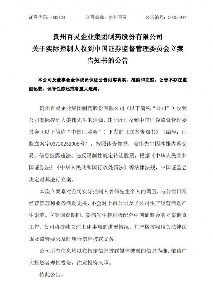 公告称,贵州百灵企业集团制药股份有限公司(以下简称“公司”)收到公司实际控制人姜伟先生的通知,其于近日收到中国证券监督管理委员会下发的《立案告知书》(编号:证监立案字03720252005号)。按照该告知书,姜伟因涉嫌内幕交易、信息披露违法、违反限制性规定转让股票,根据《中华人民共和国证券法》《中华人民共和国行政处罚法》等法律法规,中国证监会决定对其进行立案。