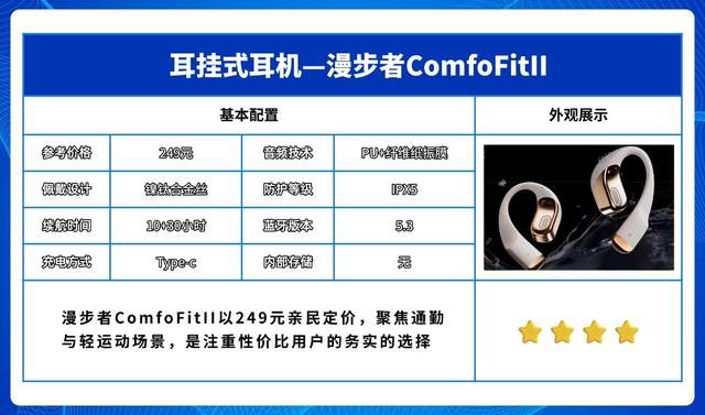 漫步者ComfoFitII以249元亲民定价,聚焦通勤与轻运动场景,是注重性价比用户的务实之选。