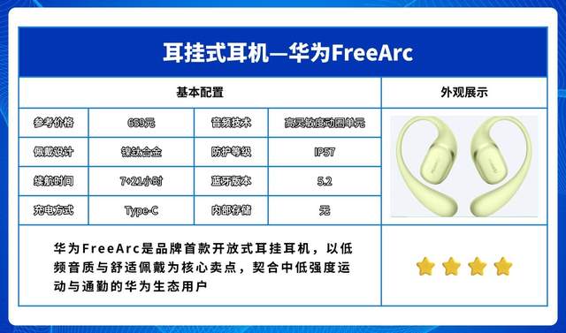 华为FreeArc是品牌首款开放式耳挂耳机,以低频音质与舒适佩戴为核心卖点,契合中低强度运动与通勤的华为生态用户。
