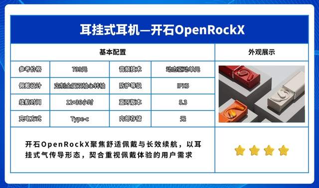 开石OpenRockX聚焦舒适佩戴与长效续航,以耳挂式气传导形态,契合重视佩戴体验的用户需求。