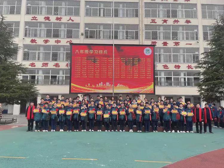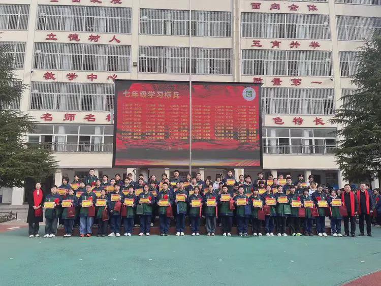 张克成副校长宣读七年级学习标兵名单,获奖学子精神抖擞、依次登台,校领导为他们颁发荣誉证书并合影留念。