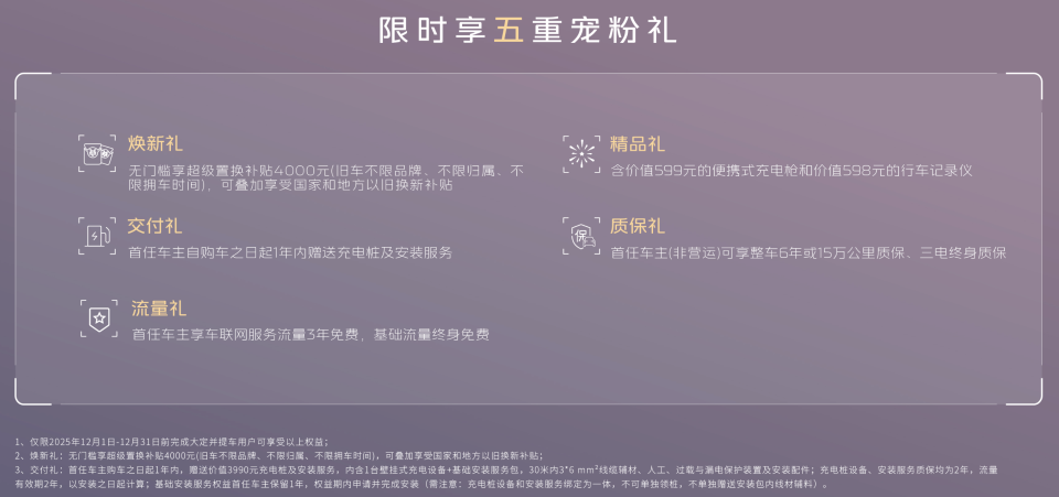 先看这份诚意满满的五重宠粉礼,每一项都戳中消费者痛点。第一重焕新礼,无门槛享 4000 元超级置换补贴,不管旧车是什么品牌、开了多少年,都能直接抵扣购车款,还能叠加地方以旧换新补贴,换车成本大幅降低;第二重精品礼,直接赠送便携式充电枪和行车记录仪,都是日常用车的刚需配置,提车就能用,省去额外购买的麻烦;第三重交付礼,首任车主 1 年内免费赠送充电桩及安装服务,在家就能轻松充电,再也不用跑公共充电桩;第四重质保礼,首任车主可享三电系统终身质保和 6 年或 15 万公里整车质保,后期用车完全不用担心里程衰减、故障维修等问题,省心又省钱;第五重流量礼,首任车主享车联网服务流量3年免费,基础流量终身免费。