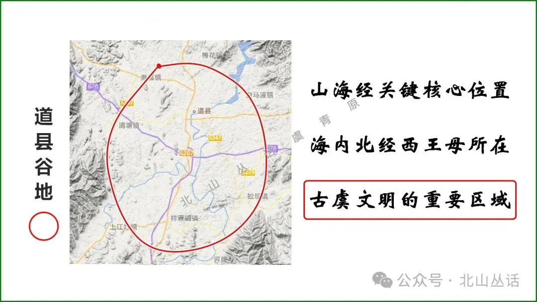 海内经起始的朝鲜和天毒,位于怀化市溆浦县和益阳市安化县交界处,距离高庙遗址约100公里。其后的山系路线也途经高庙遗址。这说明高庙遗址属于山海经文明的圈子范围。