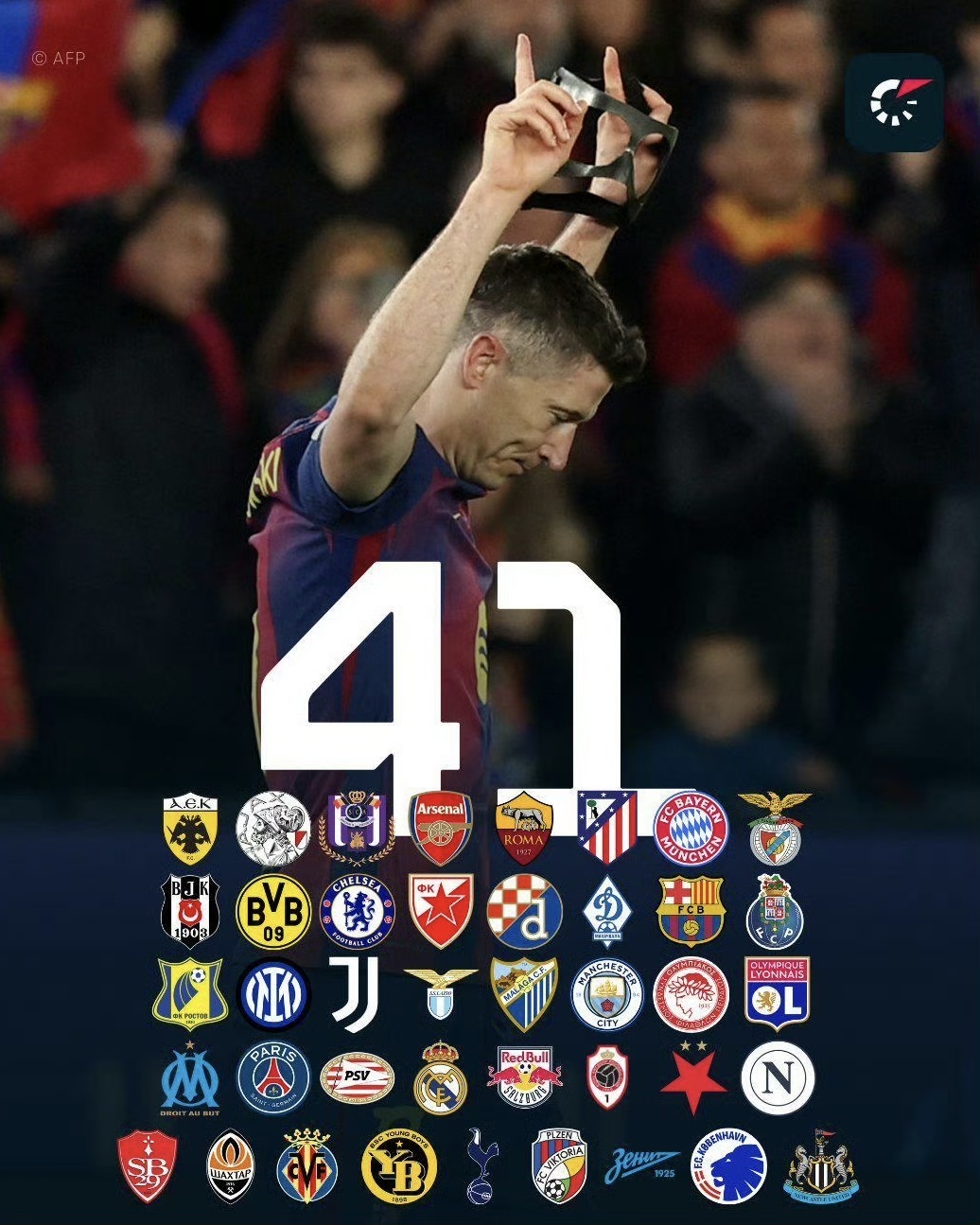 纽卡斯尔联成为了莱万在欧冠赛场上攻破的第41支不同球队的大门,他正式超越了由梅西保持的40队纪录,独自加冕欧冠历史攻破不同球队球门最多的球员。