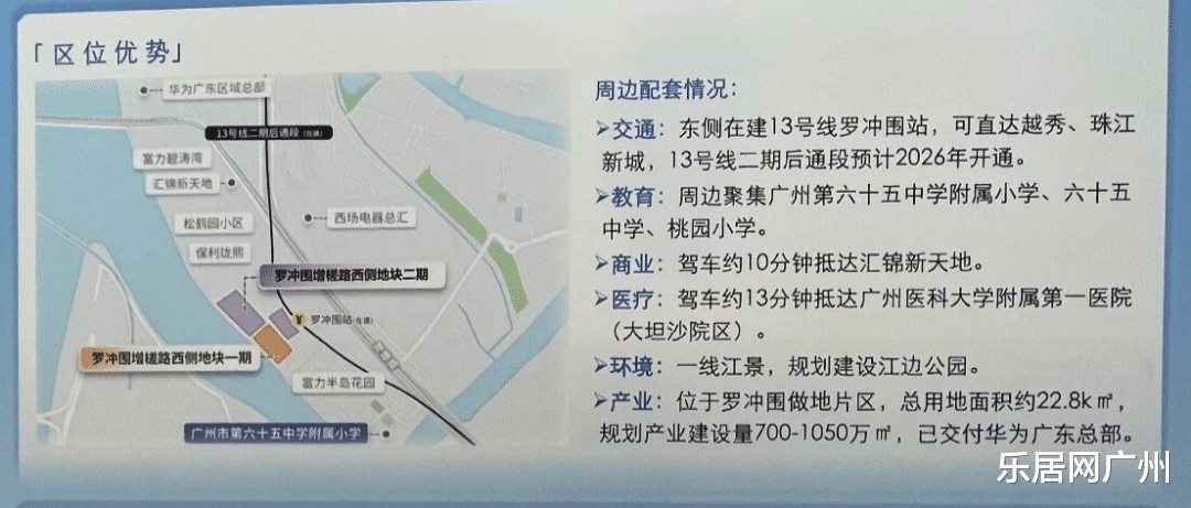 该地块涵盖一期、二期,其中一期是纯宅地,建面83554㎡;二期是居住+商业地块,容积率3.0-4.7,总建面136204㎡。地块最大的亮点就是一线南向望江,规划建设江边公园,景观视野较好。另外地块位于罗冲围做地片区,距离华为广东总部较近。