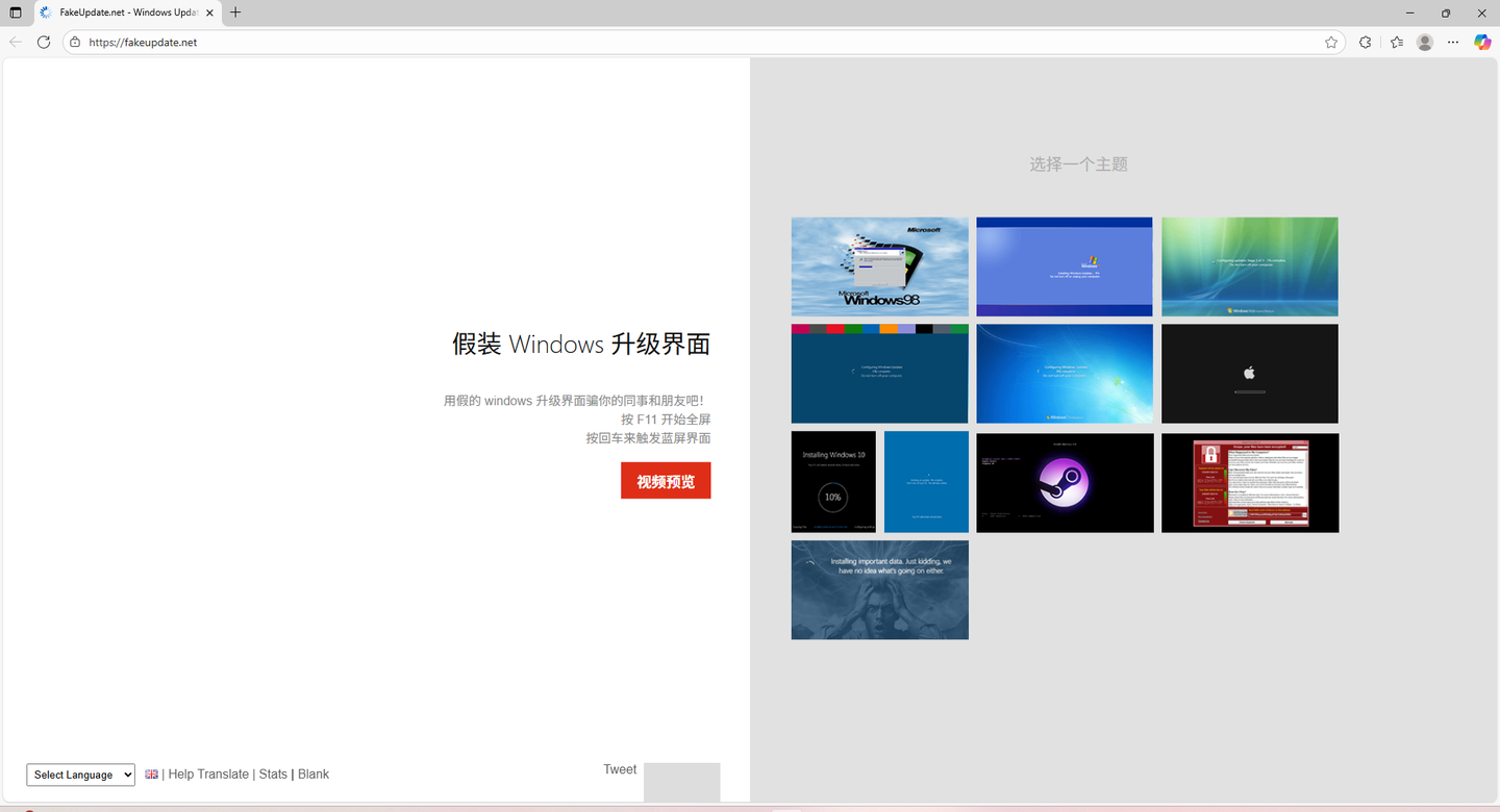7、FakeUpdate这是一个能让你每天光明正大摸鱼的网站,它可以让你的电脑假装正在升级,平时工作累了,或者需要休息一下,只需要打开这个网页,点击选择windowsmicos或者linux的更新界面,按f11开启全屏,然后你的电脑就会开始模拟升级页面界面逼真到就像真的在升级。