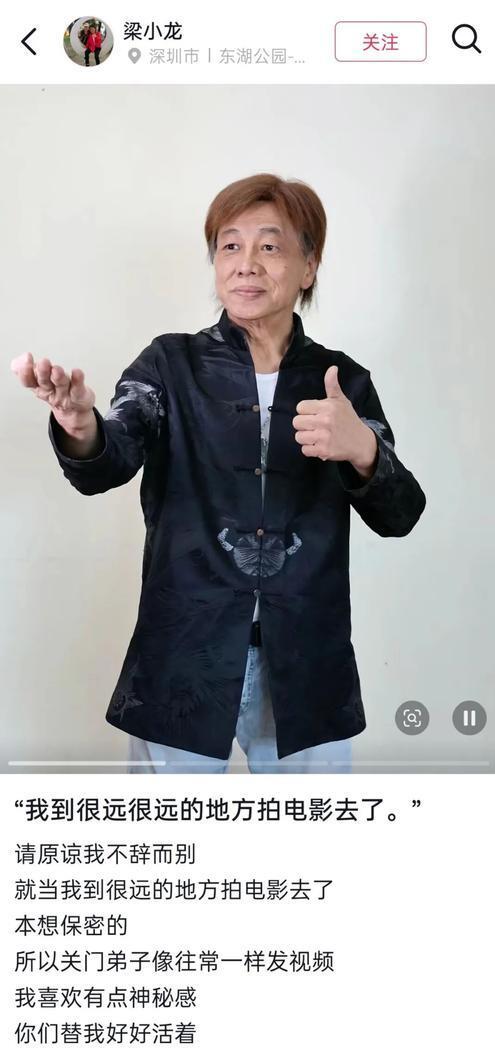2026年1月18日晚上,梁小龙的社交账号更新了一封手写信:“请原谅我不辞而别,就当我到很远的地方拍电影去了。 ”而此刻,这位75岁的功夫巨星已经离世四天。 更让人难以置信的是,从他1月14日病逝到18日告别信发布,他的账号每天仍在更新练拳视频、火锅店合影和功夫心得。 这场自导自演的“数字时代武侠剧”,竟是梁小龙生前亲自设计的浪漫告别。