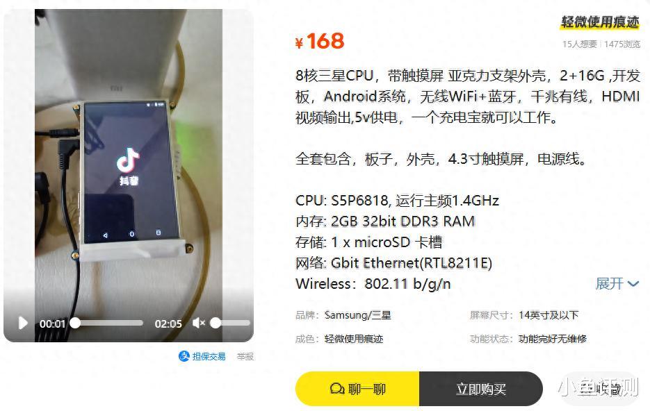 一台拥有8核处理器和触摸屏的完整计算机,价格居然被打到了一百多块。没错,这不是科幻,而是二手鱼里正在发生的。最近刷到个宝贝,三星8核CPU开发板,带屏带壳,168元包邮。这价格,现在连张像样的TF卡都买不到吧?瞬间就让我这个老数码爱好者来了兴趣。