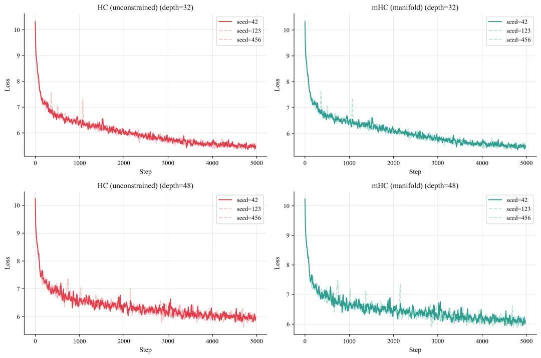 Residual:标准的残差结构,即 x + F (x) 作为基线; HC:采用无约束混合矩阵的超连接(Hyper-Connections); mHC:采用 Sinkhorn 投影的流形超连接(Manifold Hyper-Connections)。每种架构分别在两种网络深度下进行(32 层和 48 层),并使用三个随机种子(42、123、456),因此每种配置运行 3 次。
