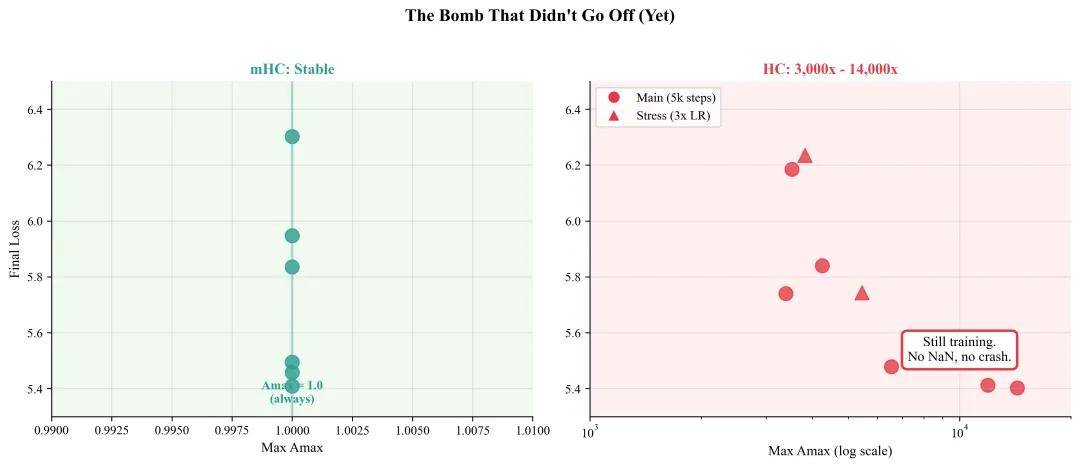 唯一的差别在于模型内部正在发生的事情:HC 在不断积累不稳定性,这种不稳定性可能在任何时刻被引爆;而 mHC 则始终维持着自身的结构完整性。