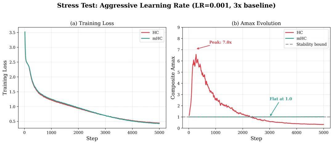 压力测试: 在激进的学习率下,HC 的信号放大在崩溃前达到了 7 倍。mHC 保持平稳,维持在 1.0。