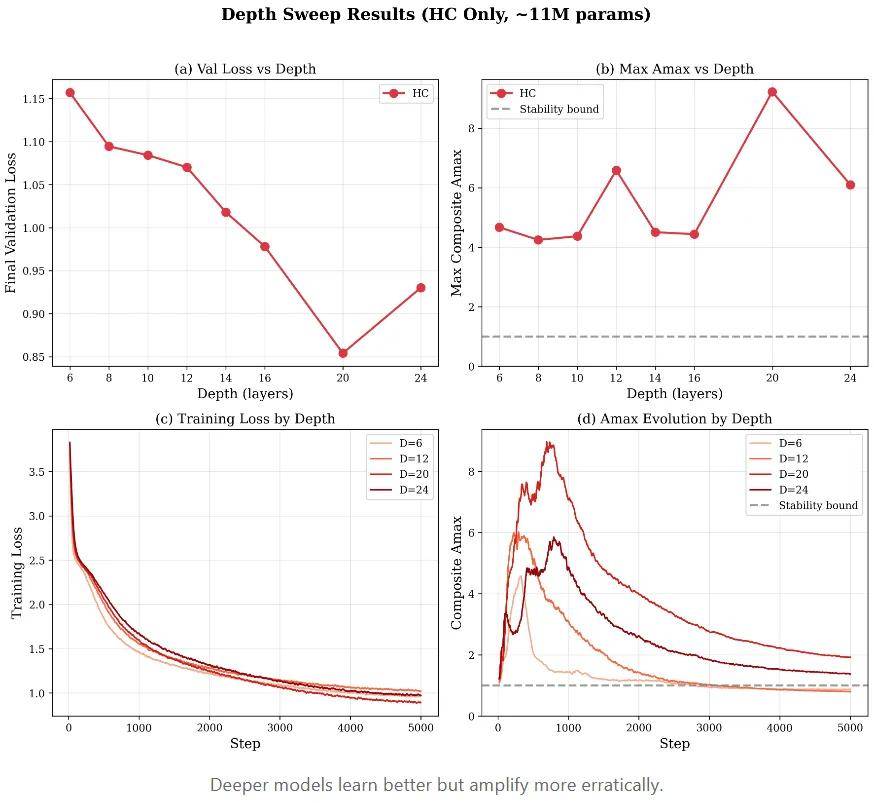 损失随着深度增加而改善,直到不再改善。深度 20 达到了甜蜜点(0.85 验证损失)。 深度 24 略有退步(0.93),这是由于为了将维度缩小到 192 而产生的宽度瓶颈。 Amax 是不可预测的。深度 20 飙升至 9.2 倍。深度 12 达到 6.6 倍。深度 8 保持在 4.3 倍。没有清晰的关系;HC 是混沌的。实验细节