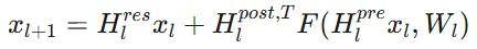 超连接(Hyper-Connections)采取了不同的方法。它不再是单一流,而是扩展到 n 条并行流,并带有可学习的混合矩阵: