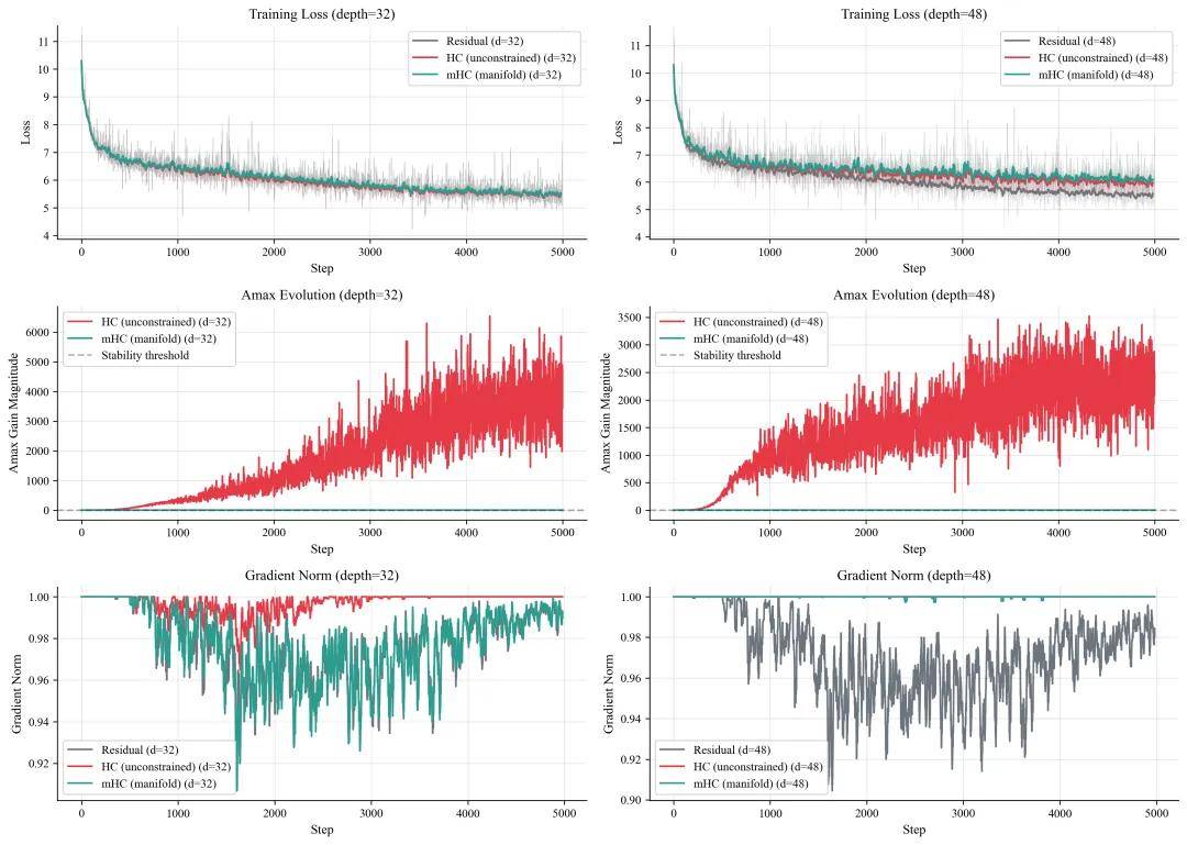 实验中发现,在深度为 32 时,HC 的 Amax 值飙升至 6500 倍,并伴随着剧烈的波动,而 mHC 值则稳定保持在 1.0。在深度为 48 时,这种模式再次出现:HC 猛增至 3500 倍,而 mHC 值保持不变。
