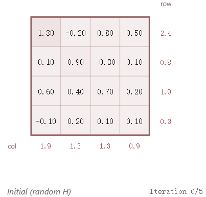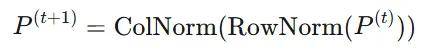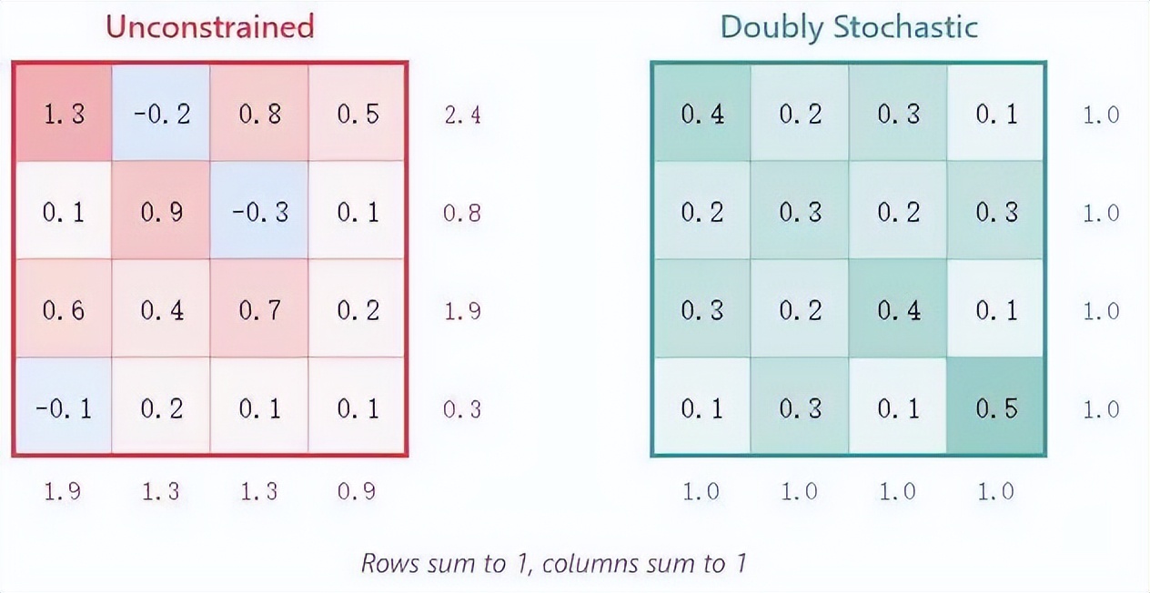 从任意矩阵(原始学习到的权重)开始 取指数使所有条目变为正数:P = e^H 归一化行,使每一行之和为 1 归一化列,使每一列之和为 1 重复 3-4 个步骤,直到收敛就是这样。交替进行行和列的归一化。二十次迭代就足够了。