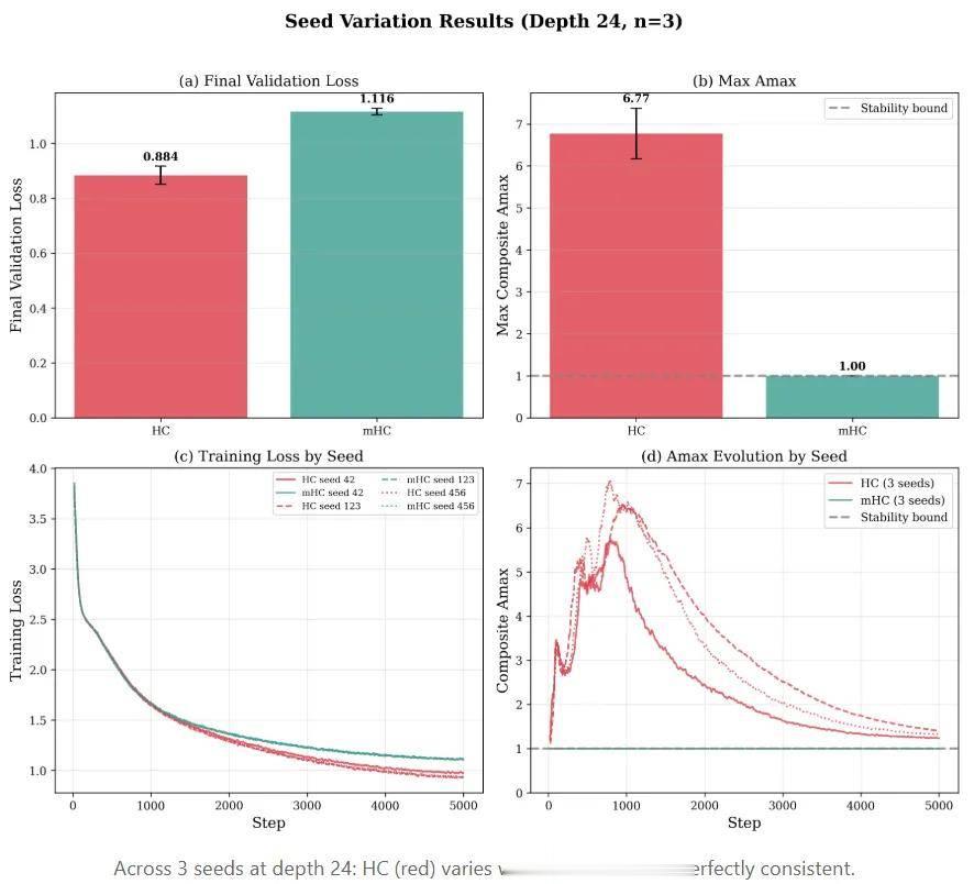 但看看方差。HC 的损失在不同种子间的变化是 mHC 的 3 倍(±0.033 vs ±0.012)。至于 Amax?HC 根据种子的不同在 6.1 到 7.6 之间摆动。mHC 是 1.00。每一个种子。每一次运行。零方差。