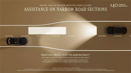 此外,大灯还能向路面投射警示图案,该功能属于奔驰选装的数字增强套件。可投射的内容包括车道偏离提醒、逆行警示,还有全新低温警示标识——路面结冰时,会在车前投射雪花图案。
