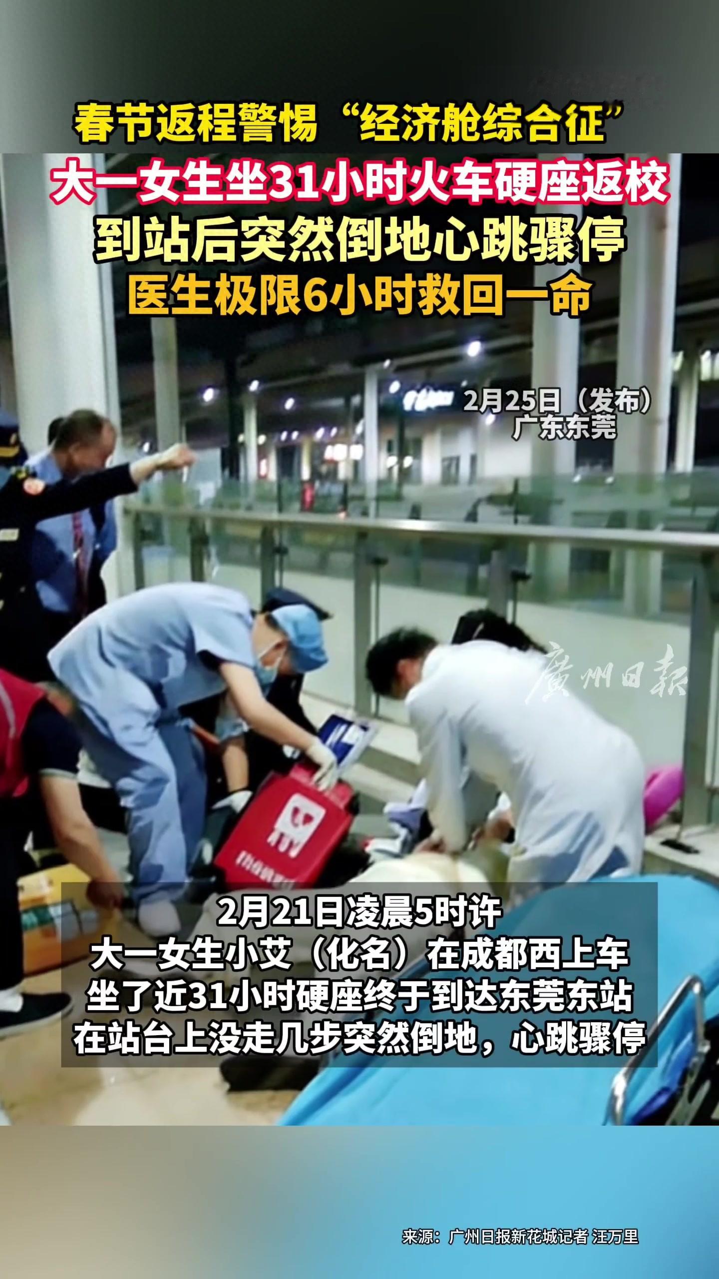 2月21日凌晨5时许,从成都上车坐了近31小时硬座的大一女生小艾(化名)刚下东莞东火车站,在站台上没走几步突然倒地,意识丧失,随后心脏骤停。所幸经送医6小时抢救,医护人员终将小艾从死亡线上拉了回来。