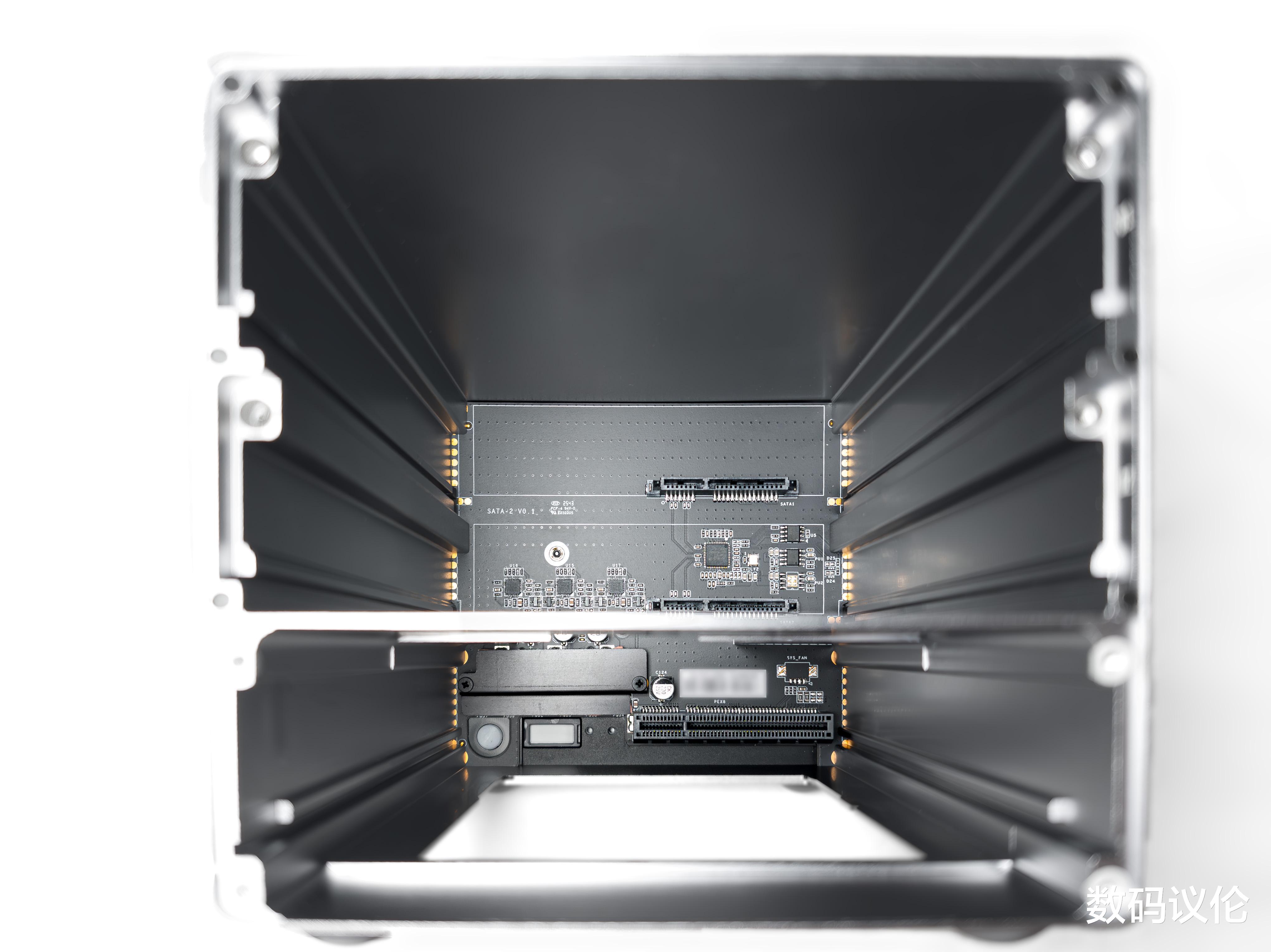 主板和两个盘位均通过插槽与前面板连接,实现了高度模块化的设计。