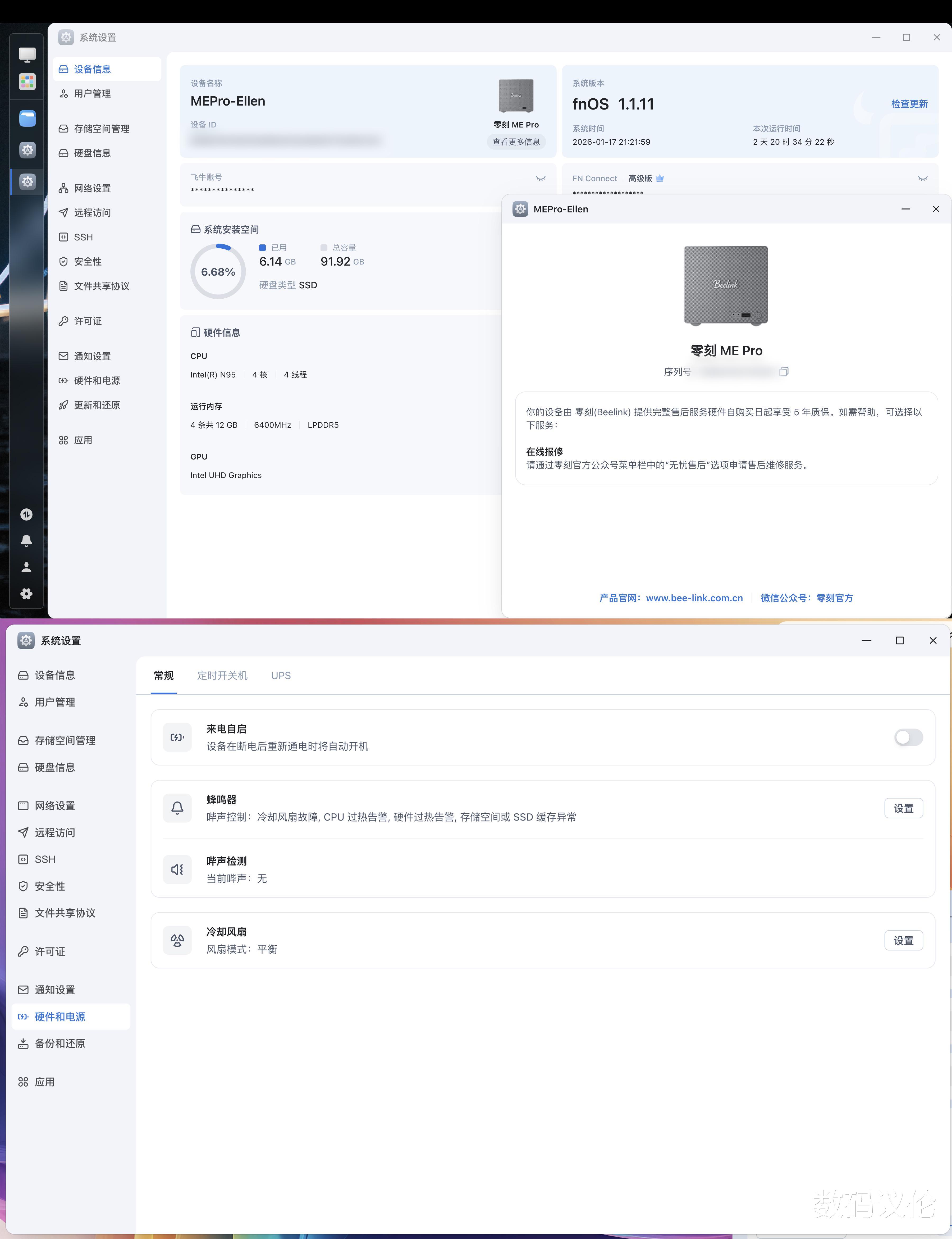 进入设置,我们可以看到零刻ME Pro的商业版飞牛是妥妥的“氪金玩家”待遇,有专门的设备型号识别、售后指导。