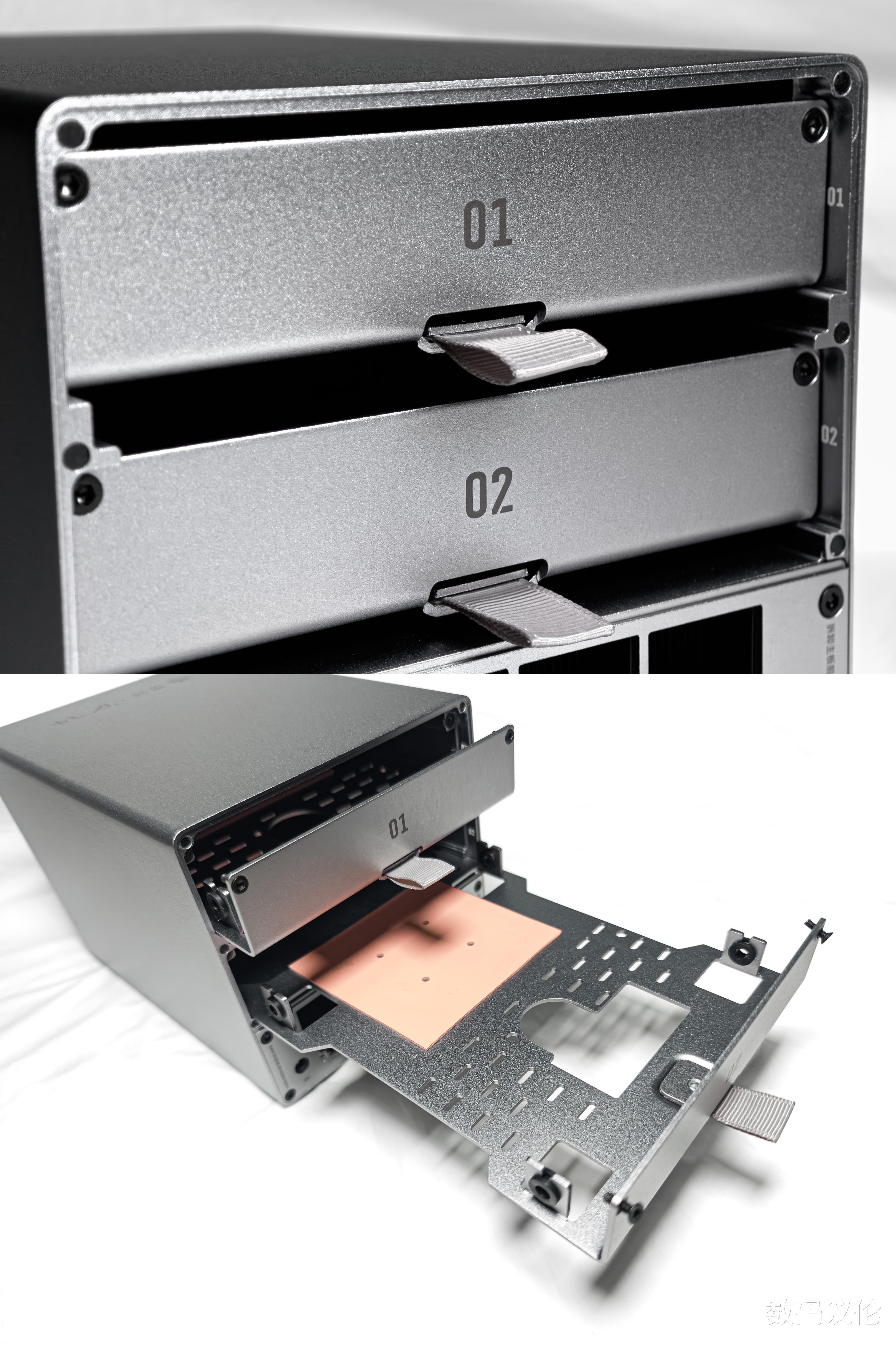 两个盘位四角有四颗螺丝固定,取下后轻拉软质的织带拉手,便可抽出盘位。盘位上有相应的硅胶散热垫。