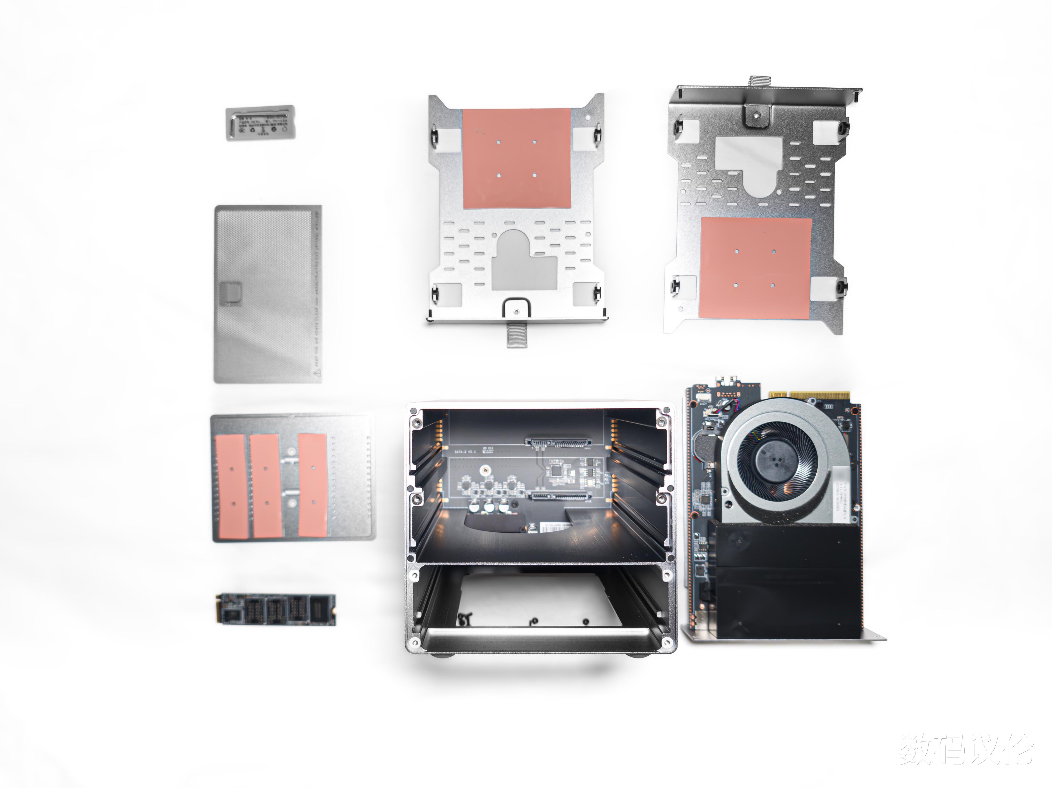 不得不说,这个包装盒紧凑的空间利用确实唬人哈哈哈,我们取下背面的磁吸散热网罩,然后拧下两个盘位的固定螺丝,便可取出。