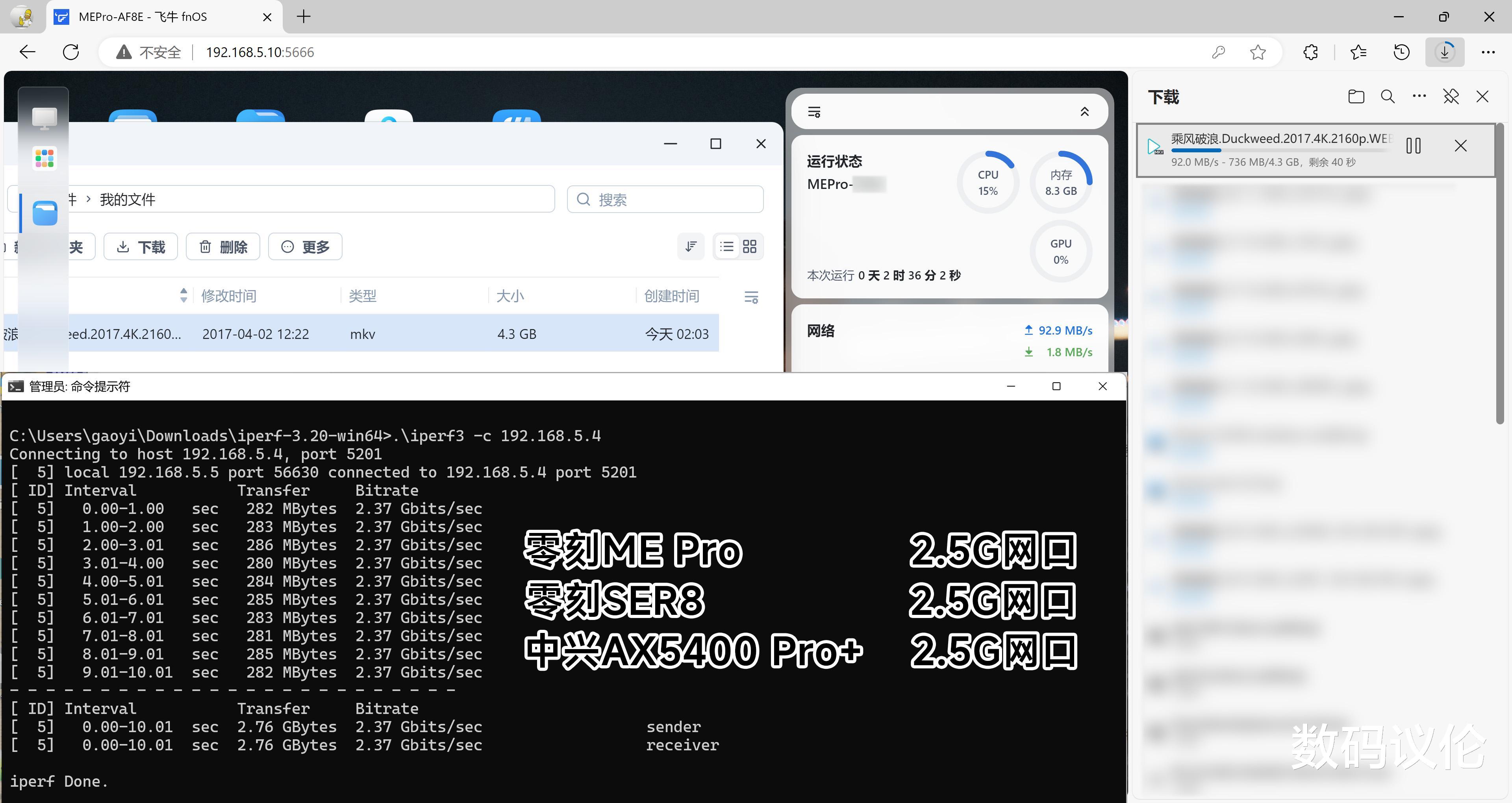 在中兴AX5400 Pro+路由器 + 零刻SER8客户端的全2.5G网口环境下,网口速率基本跑满了。