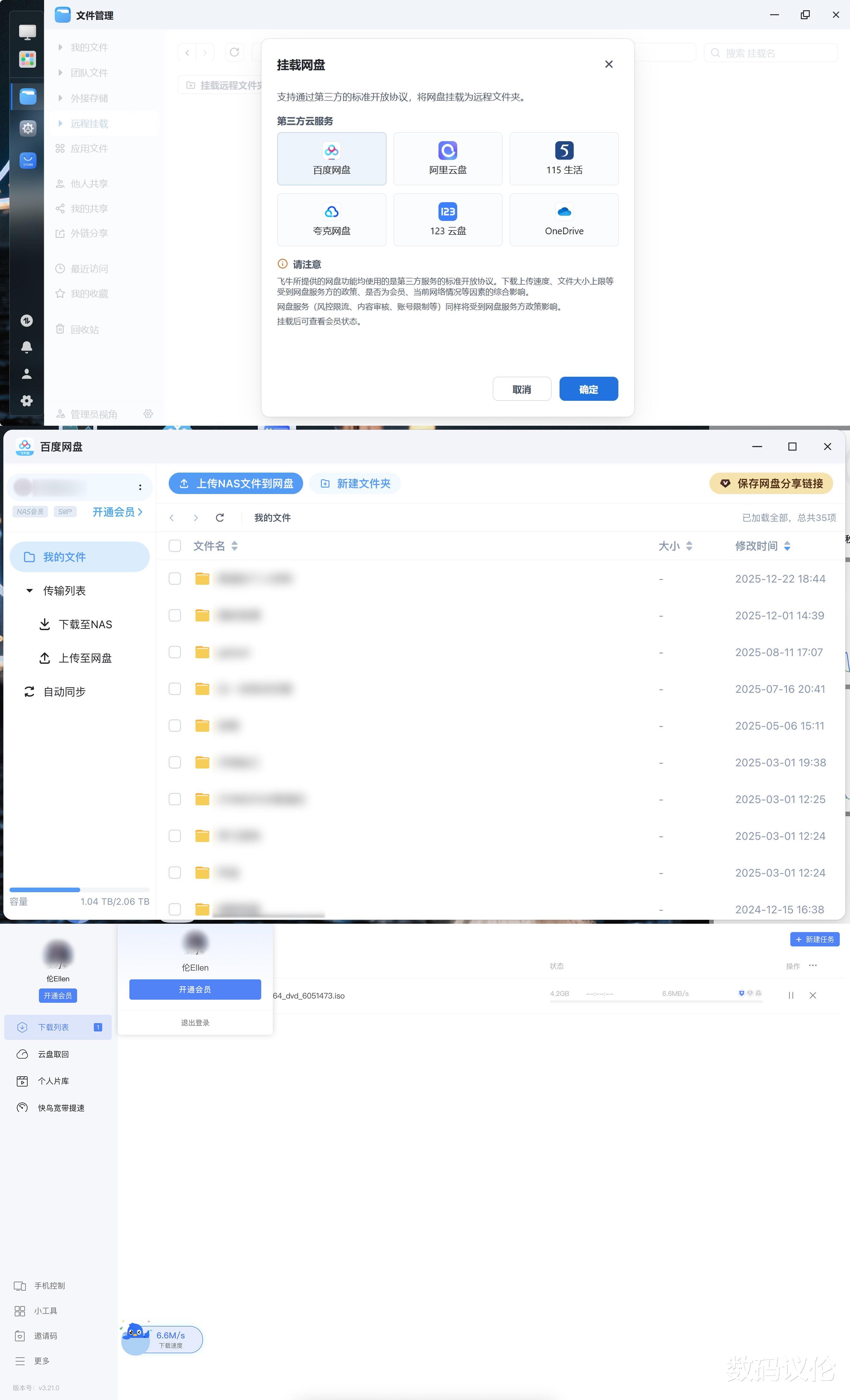 支持挂载远程文件夹(SMB、WebDAV、FTP、SFTP、NFS),支持挂载开放协议网盘(百度网盘、阿里云盘、115、123、夸克、OneDrive)。