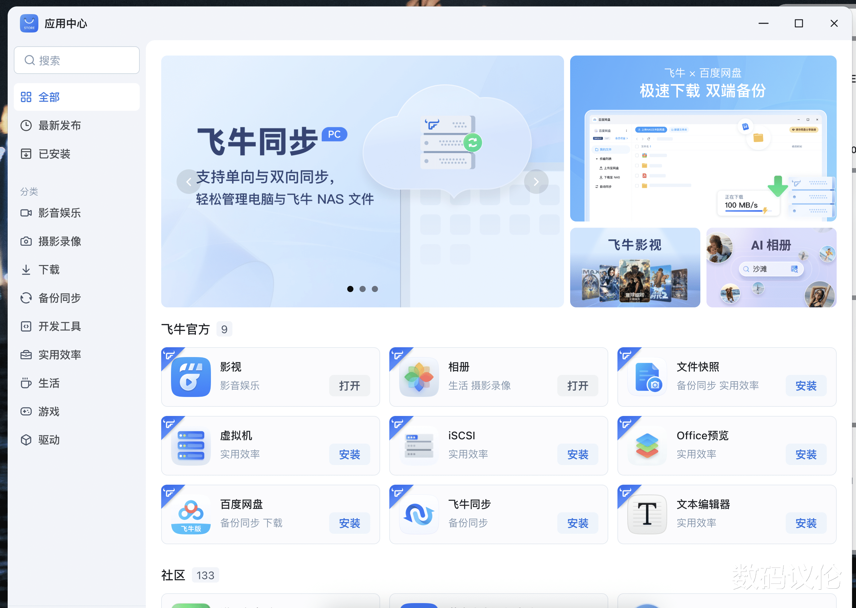 也可以安装国内常用的下载服务平台——百度网盘和迅雷的独立应用。之前迅雷还是群晖移植的Docker版本,前几天上线了原生适配飞牛的版本了。