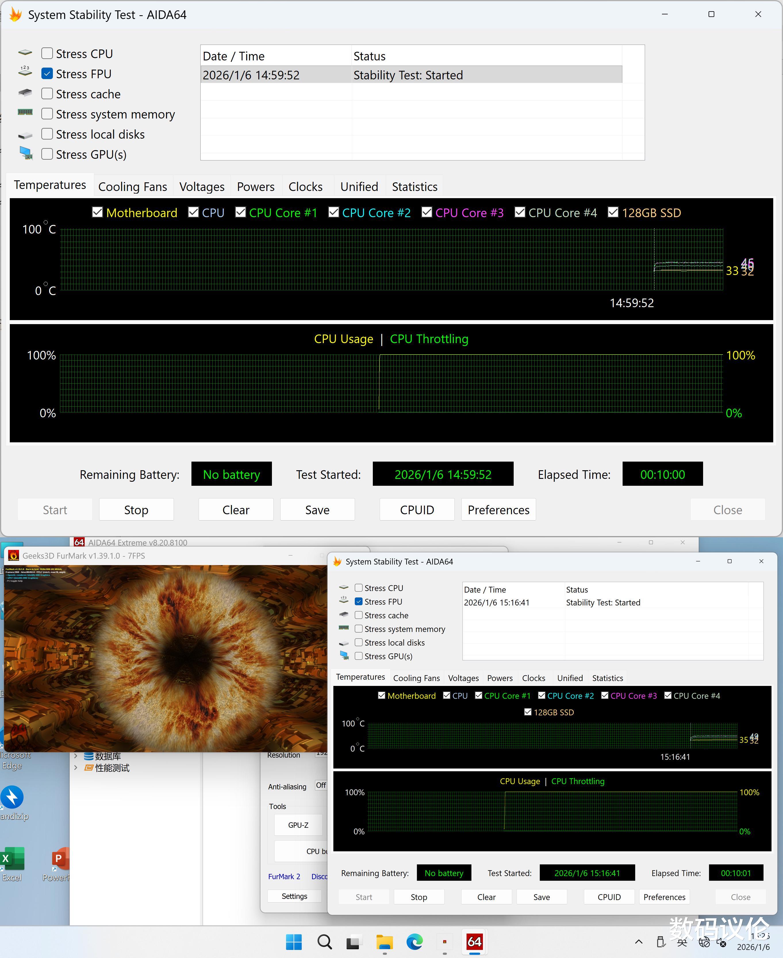 进一步对ME Pro进行烤机,无论是单FPU压力测试10分钟还是加上GPU双烤,主要器件温度都在50度以下且后续温度波动较小,稳定运行。