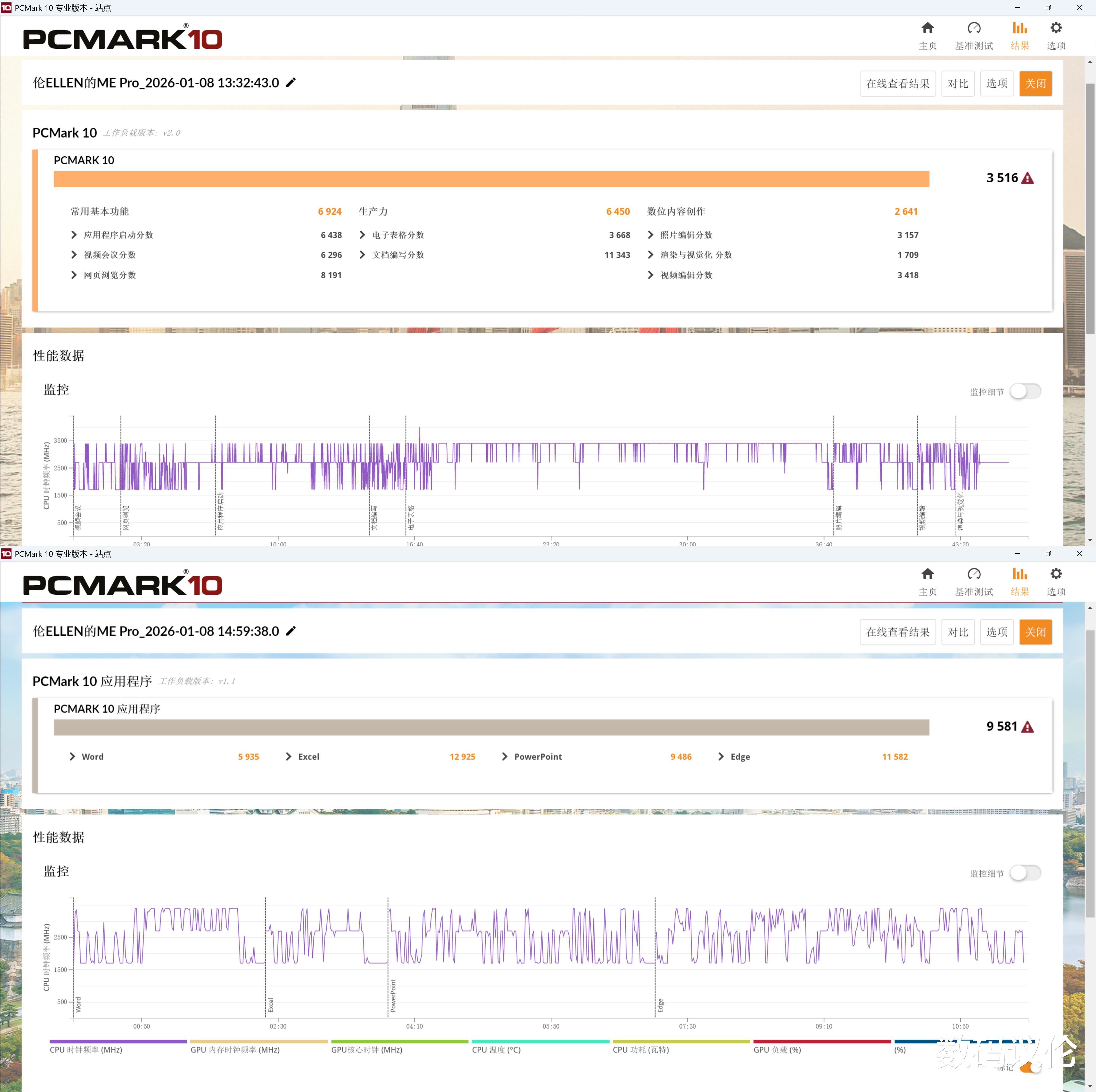 偏向常用办公场景的PCMark 10测试中,如果你配上一块还不错的固态,跑分能达到3516,应用程序跑分9581,因此这种中低压力的场景用起来问题不大。