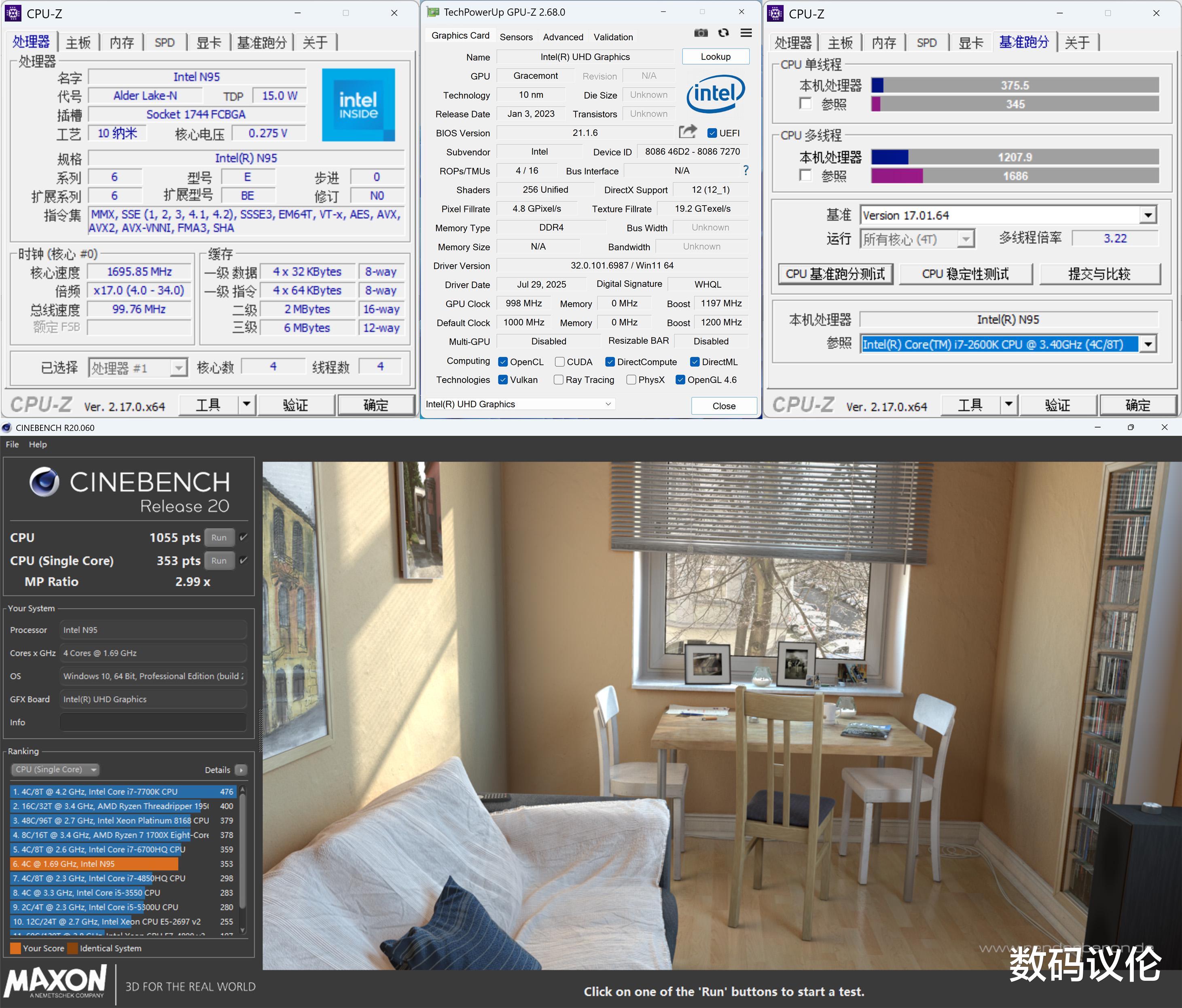 实测CPU-Z单线程375.5,多线程1207.9;Cinebench R20单核353,多核1055。