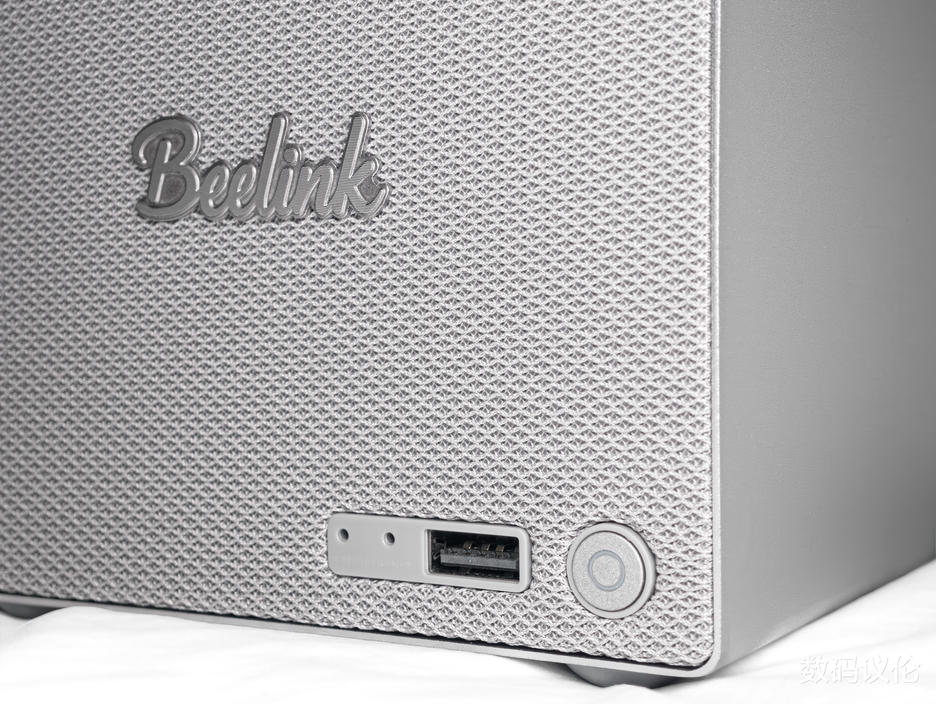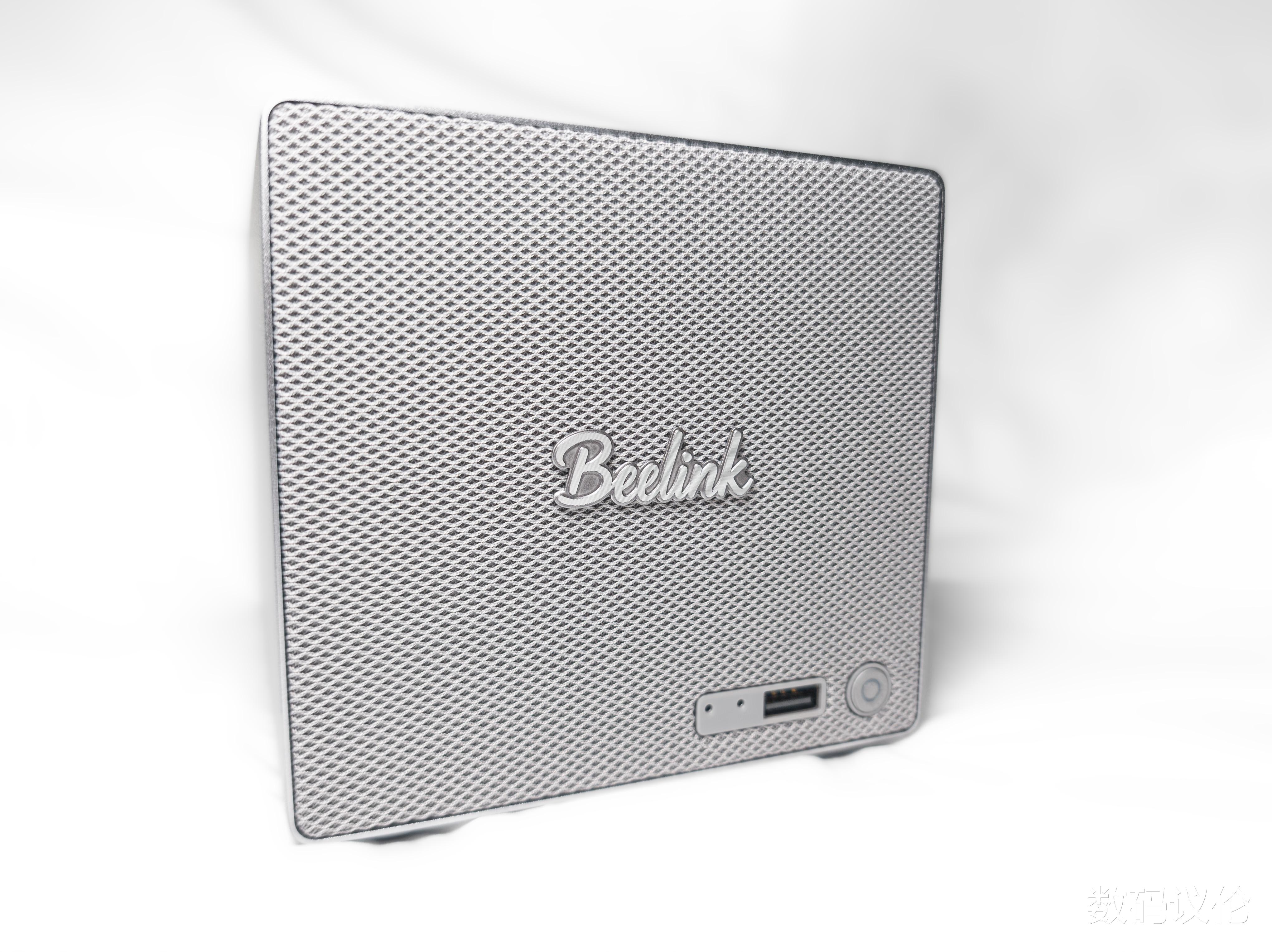零刻ME Pro正面采用了包布的网面工艺,中心位置是艺术手写风格的Beelink(零刻)logo。