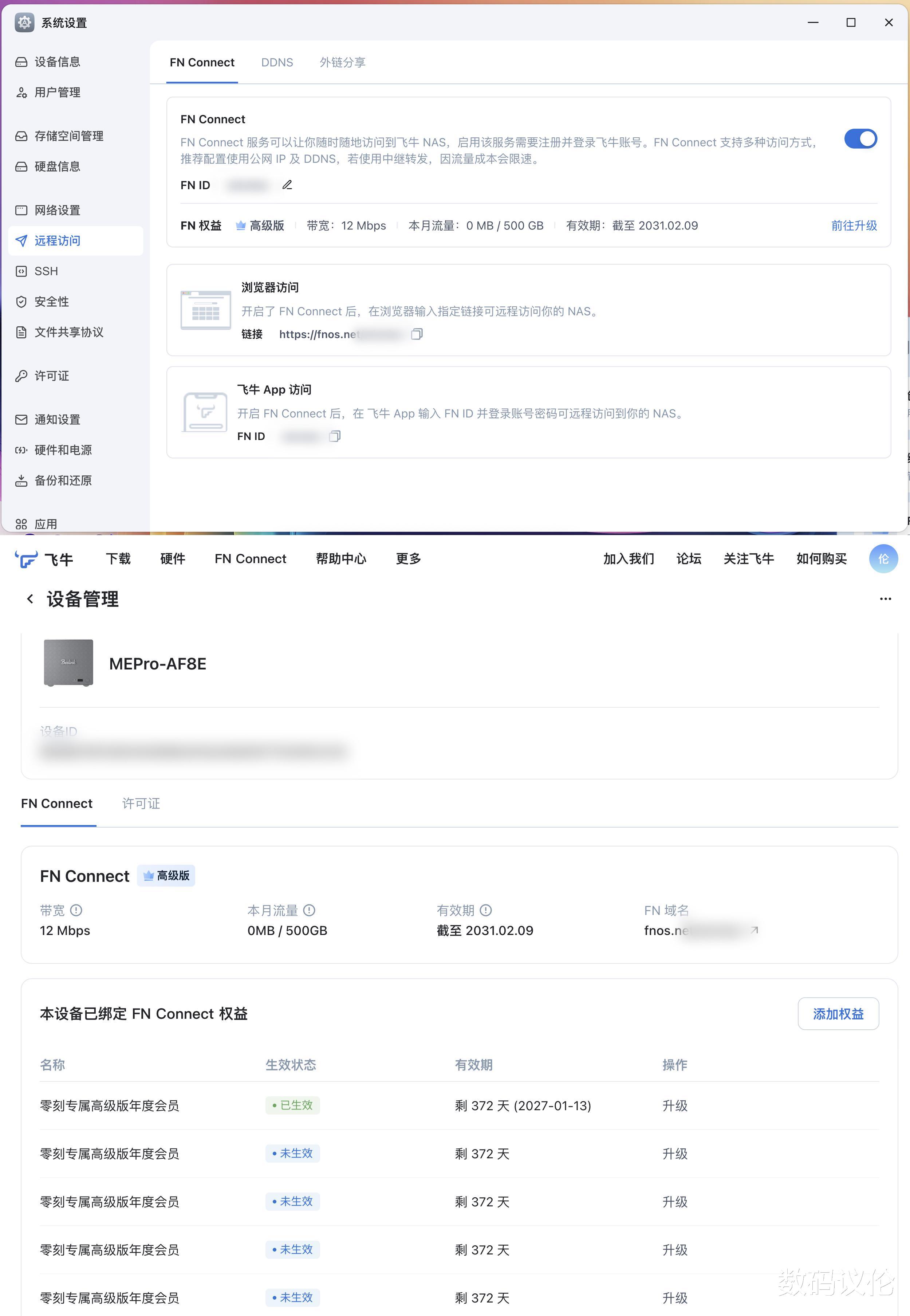 同时,出厂赠送5年的FN Connect服务高级版,每月有500GB高速(12Mbps)外网访问流量,官网可以看到有效期信息。